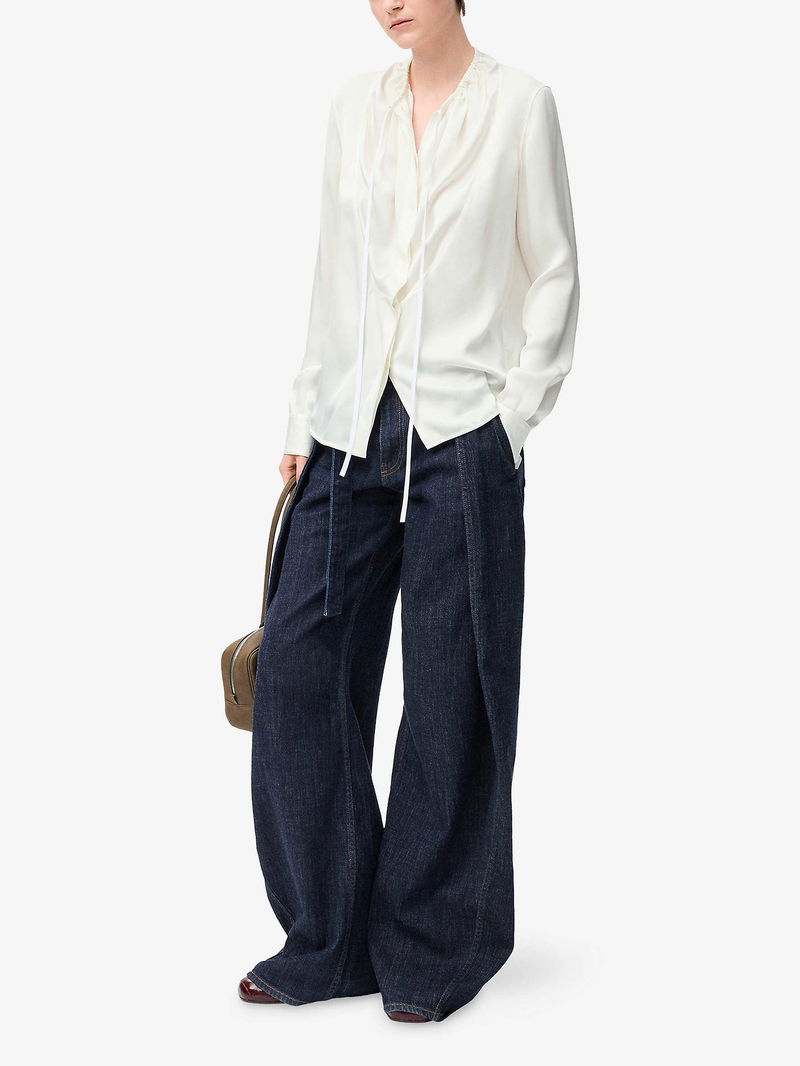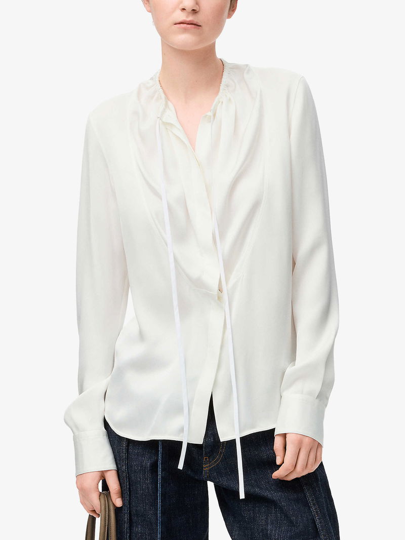 Draped-Neckline Long-Sleeve Cotton-Silk Blend Blouse