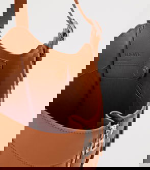 The Hammock tote bag's unorthodox proportions are typical of Jonathan Anderson's design language for Loewe, and refreshed here in caramel-coloured tan leather and suede. Crafted in the label's native Spain, it's shaped with innovative expanding panels that are set with zips and finished with lacquered edges, then lined with black leather and finished with two slip pockets.