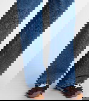 Buttoned and concealed zipper closure logo at the back label ankle length five-pocket style side pockets back patch pocket belt loops high-waisted fit.