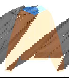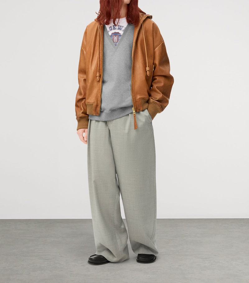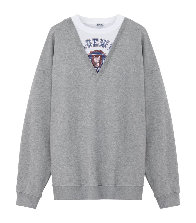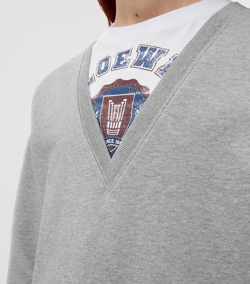 At loewe, things are not always as they seem; throughout its collections, the Spanish brand has introduced trompe l'oeil techniques, bringing textural depth to each look. Here, it offers a unique twist on the classic sweatshirt, leaning into the style's collegiate associations with a faux crest logo T-shirt layered underneath a V-neck sweatshirt.