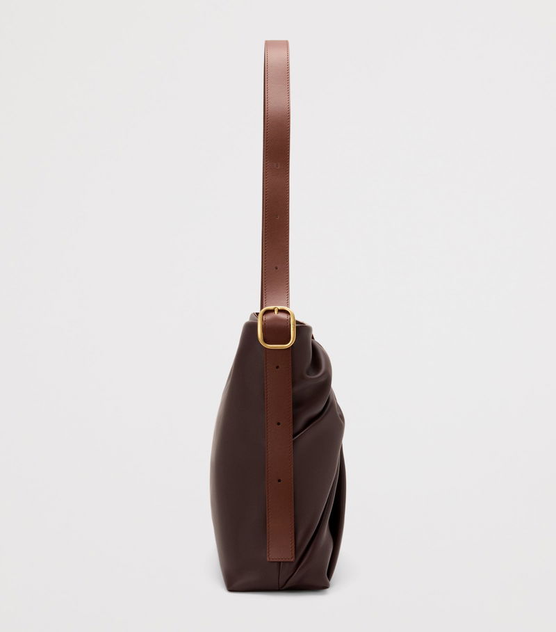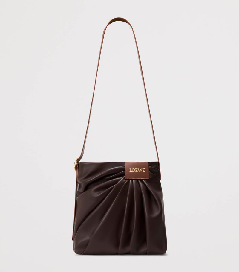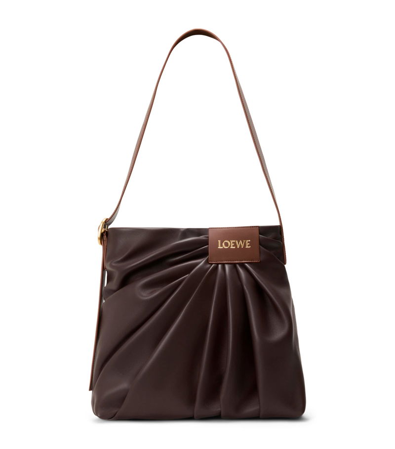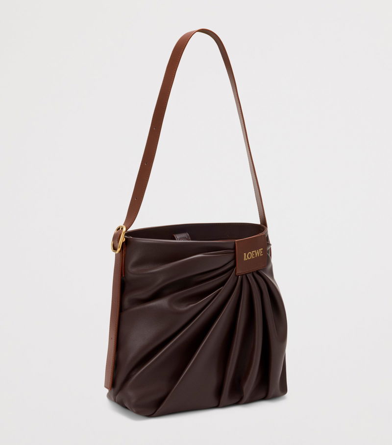 The Draped tote bag channels the fluid movement of loewe's signature ready-to-wear silhouettes into sculptural form. Crafted from supple leather that folds and curves with effortless grace, its fluid shape is anchored by a wide strap finished with a gleaming engraved buckle - a detail that adds structure to its soft profile while nodding to the House's tradition of artisanal innovation.