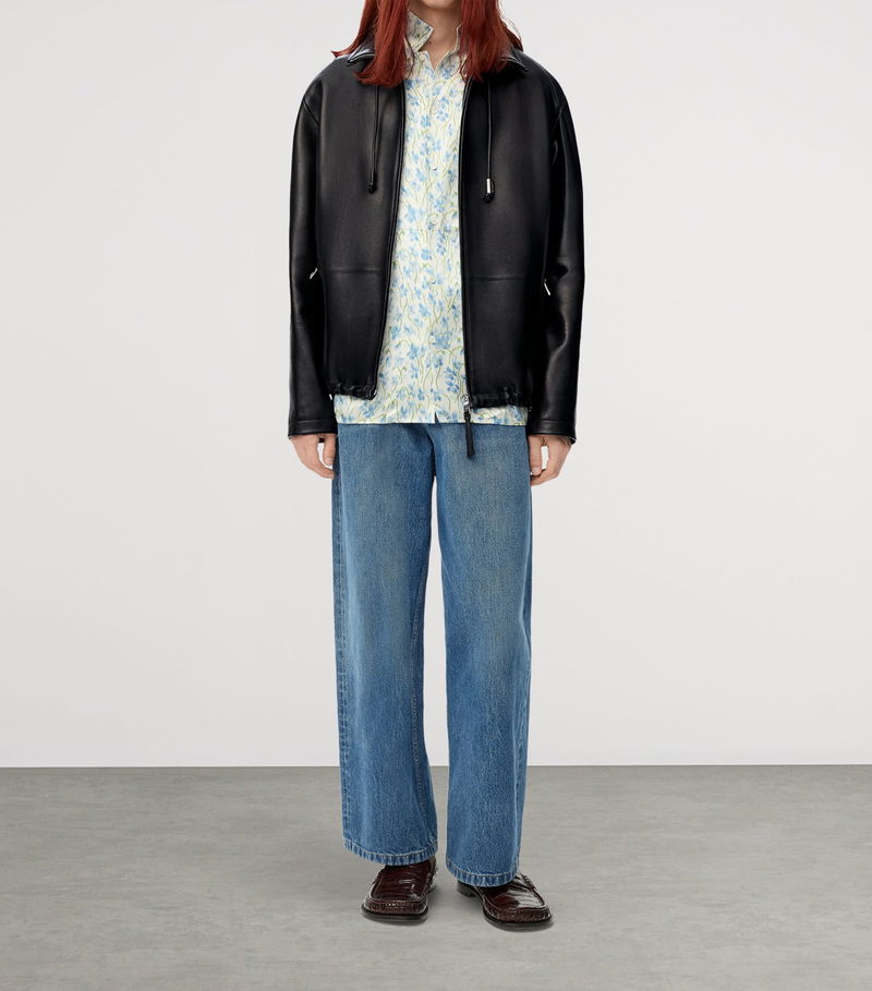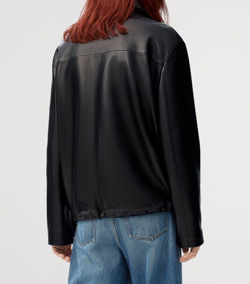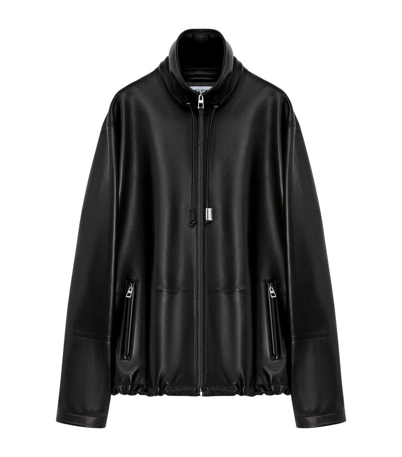 In the hands of loewe, staple silhouettes from sportswear and workwear are transformed through its famed supple, buttery-smooth leather, bringing them into its whimsical stylistic world. Here, for example, the brand elevates this track jacket with a soft lambskin, trimming the style with chunky silver hardware and a cinched-in elastic waist.