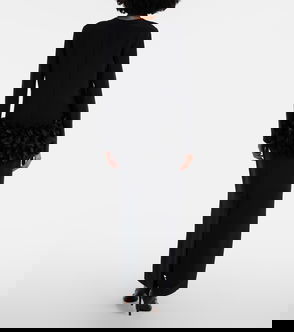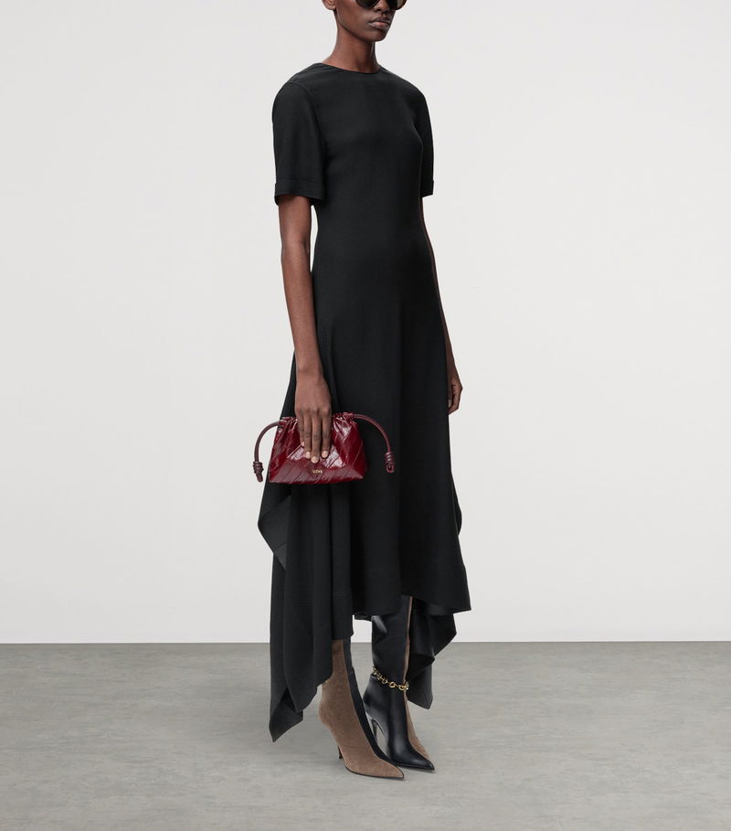 Loewe has the magic touch, turning simplistic form into statements that challenge the perception of beauty and the material. Beginning life as a simple T-shirt maxi dress, this monochromatic offering gently flares down to a handkerchief hem that's supported by the weight of the leather inserts.