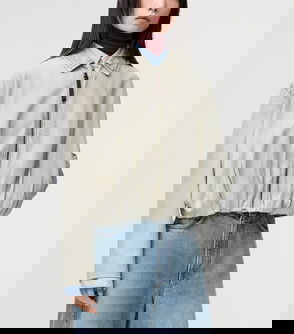 Spread collar, long sleeves, two round patch pockets at front, ribbed trims, gold-toned hardware, logo patch at back