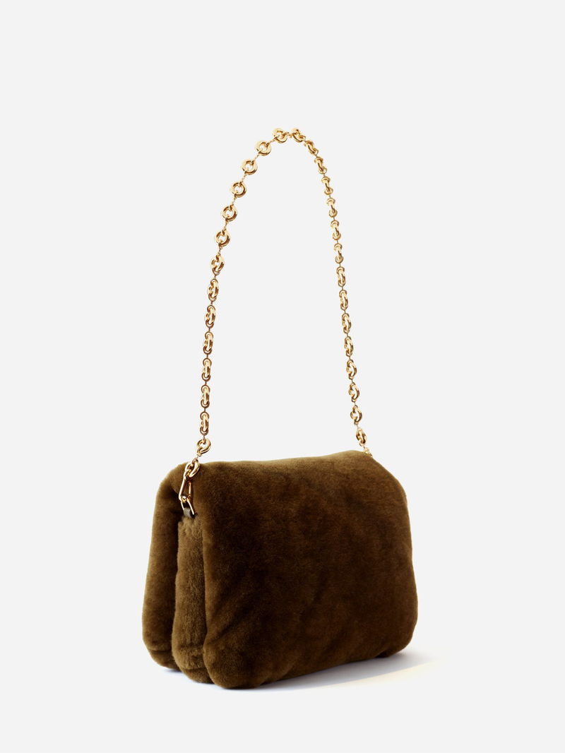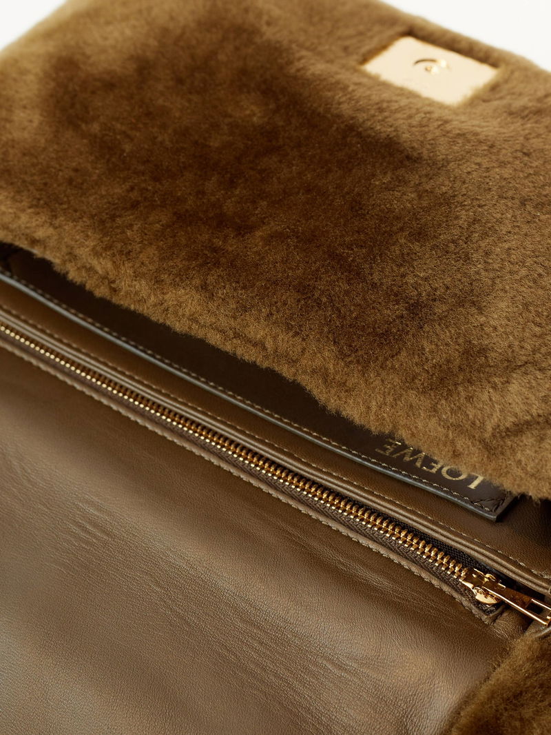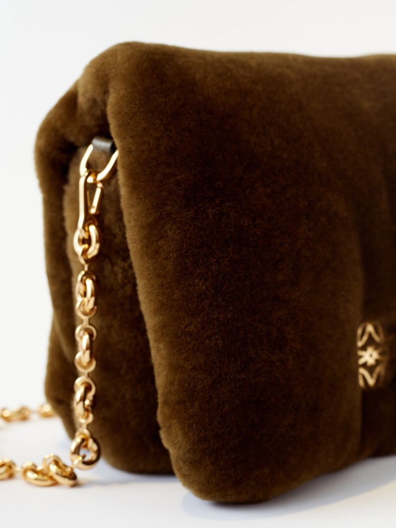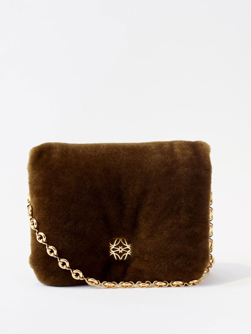 Loewe enhances the dramatic, padded silhouette of its brown Puffer Goya shoulder bag by rendering it in plush shearling with a supple leather lining.