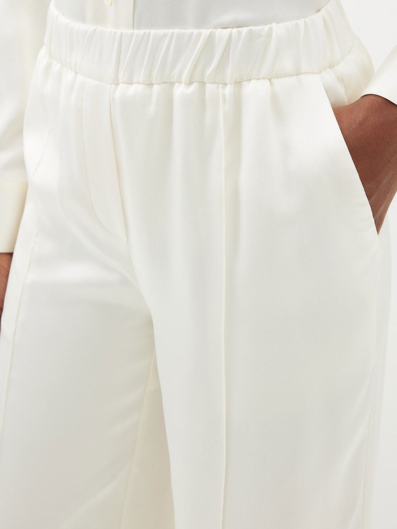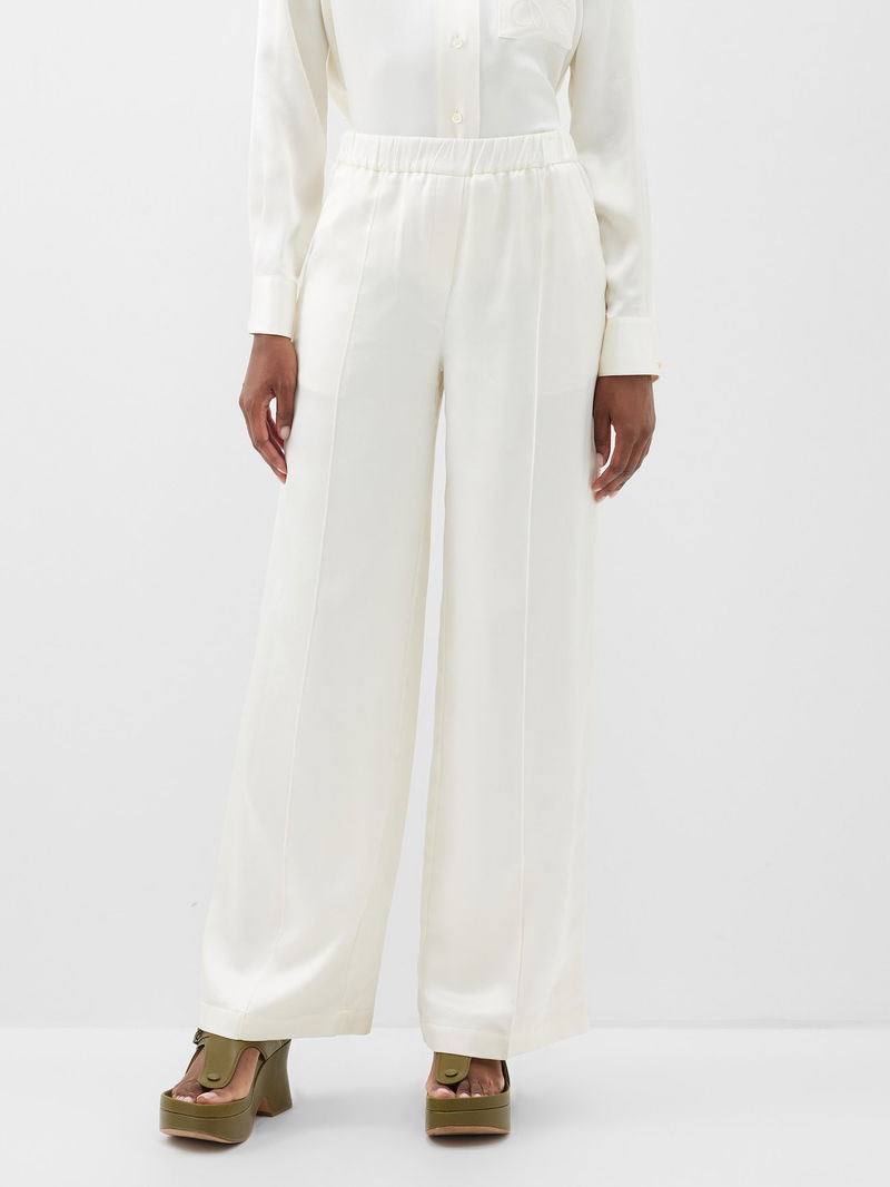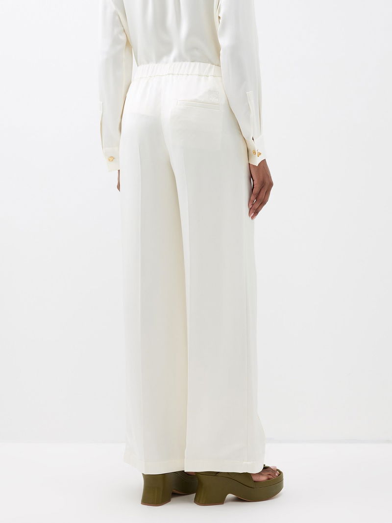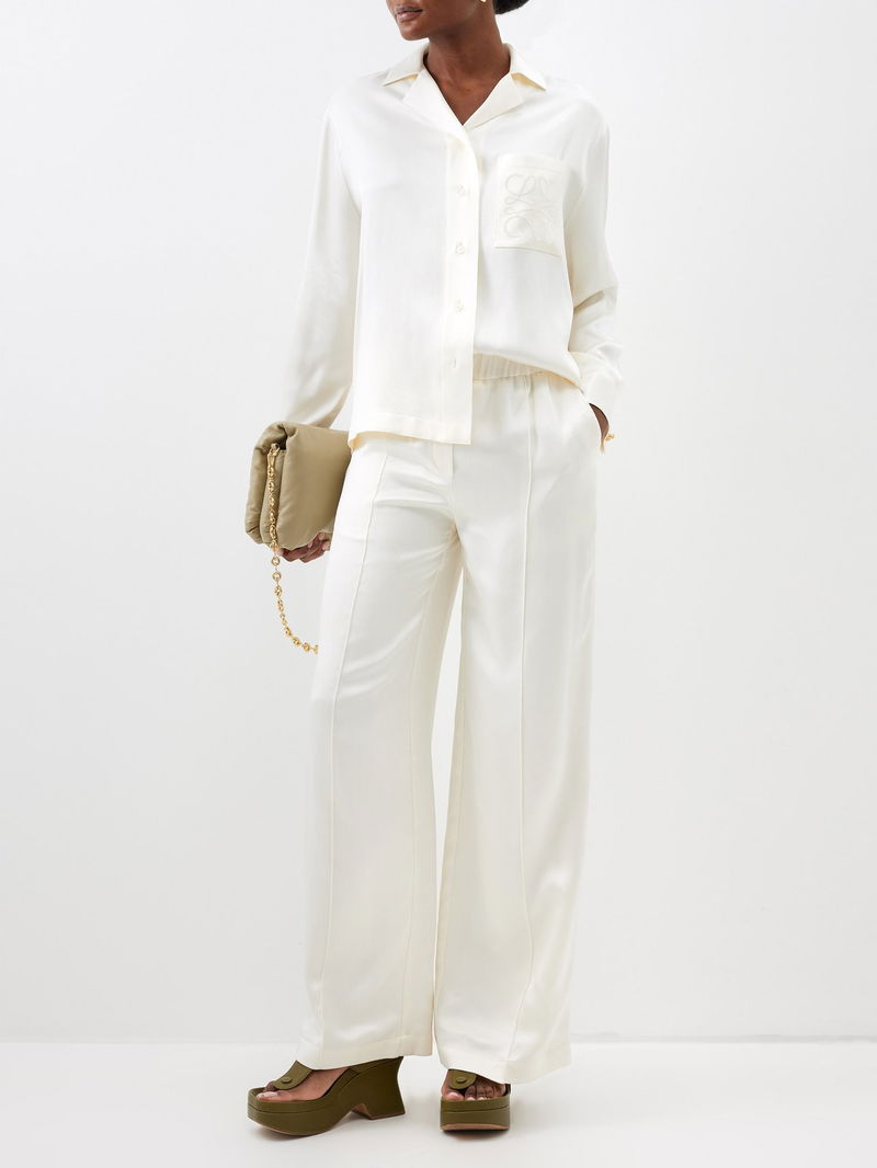 Incorporating tailored attributes, Loewe’s ivory pyjama-style trousers are cut from a fluid silk-blend fabric with central pressed creases, faux fly detailing and side pockets.