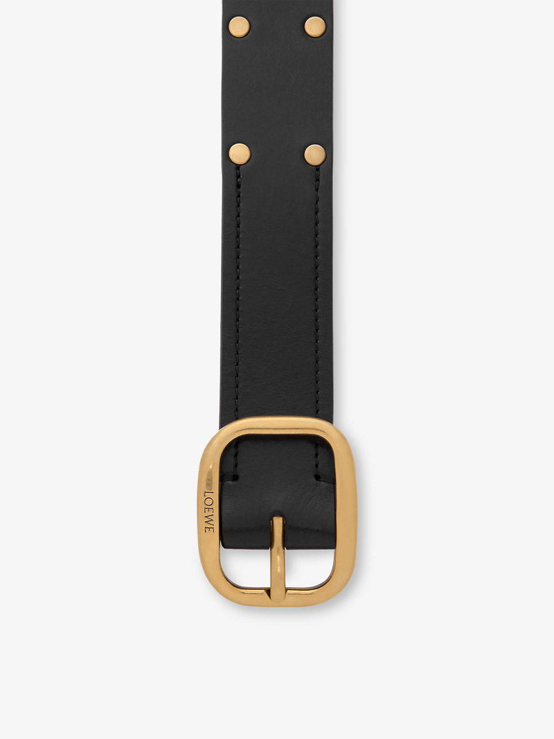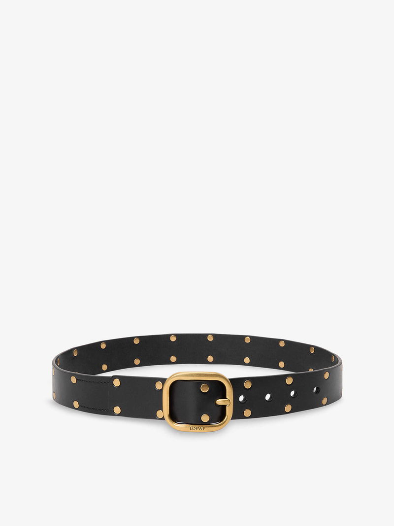 Loewe leather belt. Adjustable buckle fastening. Rounded buckle, engraved branding, gold-toned hardware, five holes, pin buckle, all-over stud embellishments.