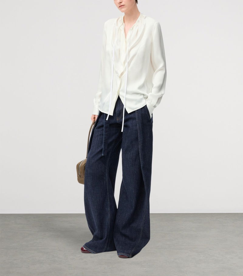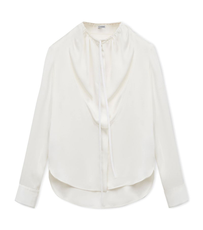Loewe has been toying with unique draping of fabric for decades, with icons like the Flamenco using drawstrings to cinch and distort supple nappa leather. Here, it applies the same design process to a blouse, which features a lightweight silk satin that's brought in by an asymmetric button fastening and can be distorted with the channelled neckline tie.