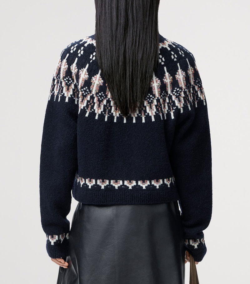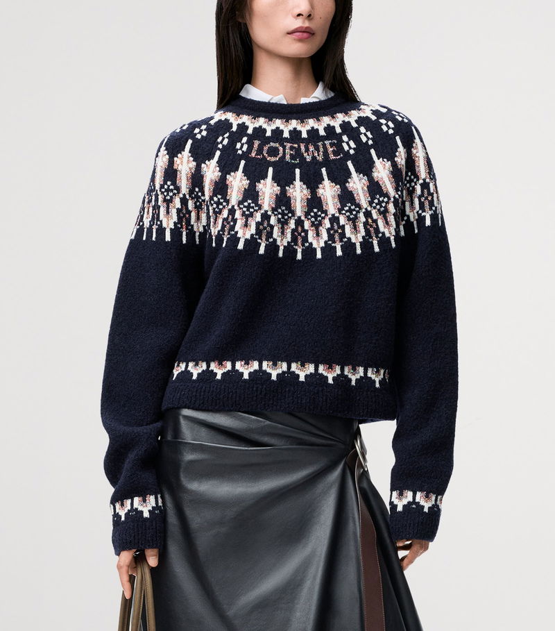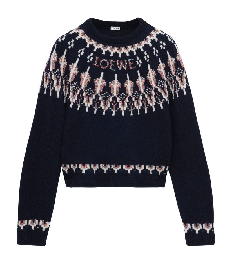 For a contemporary classic, Loewe presents its own take on a winter warmer. Cut to a relaxed, boxy silhouette, this wool-blend sweater shines bright with a Fair Isle design in sequinned yarn and is signed off with a shimmering rendition of the House's moniker.