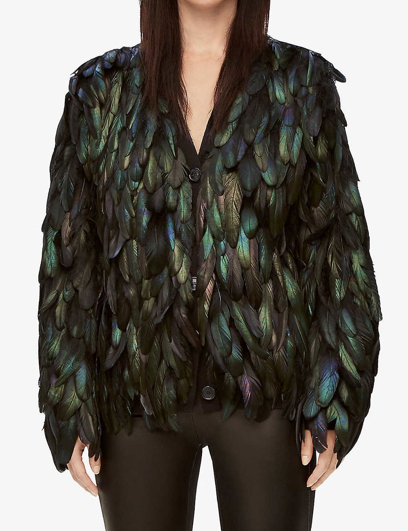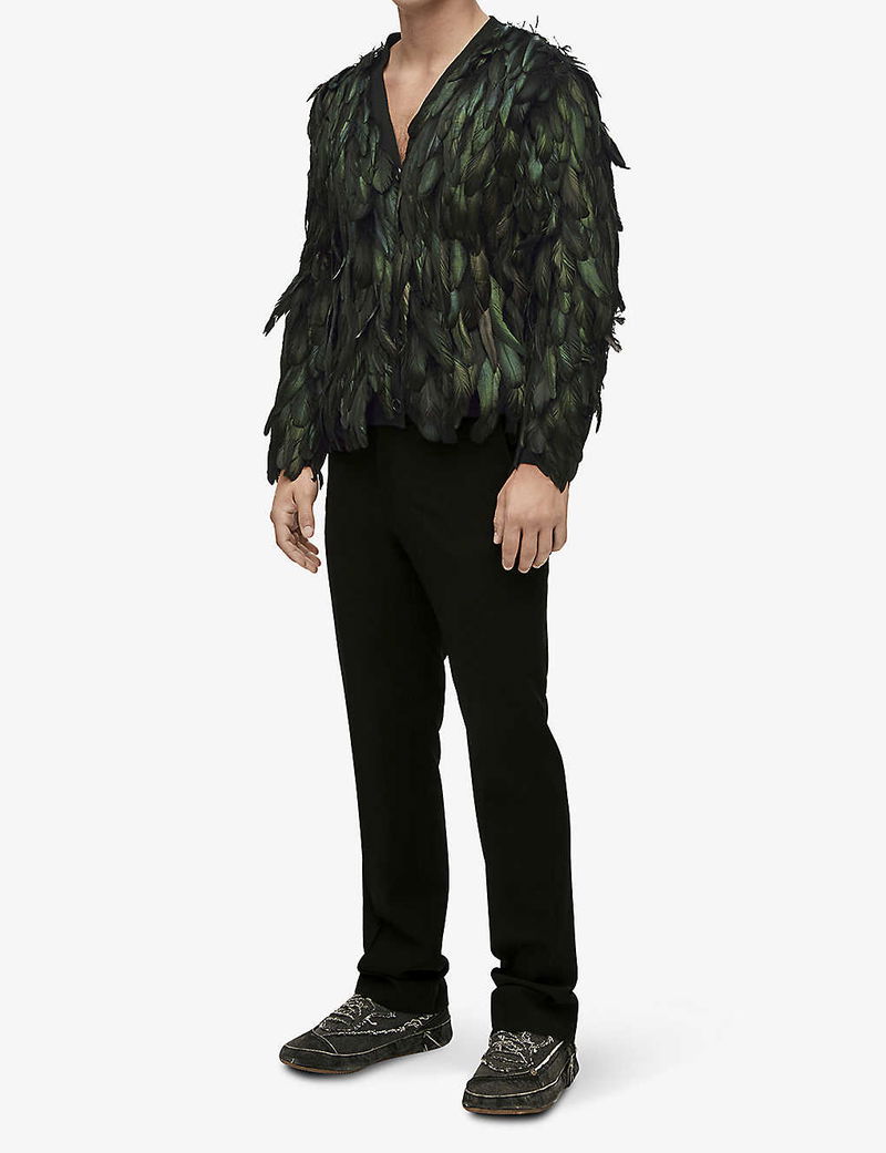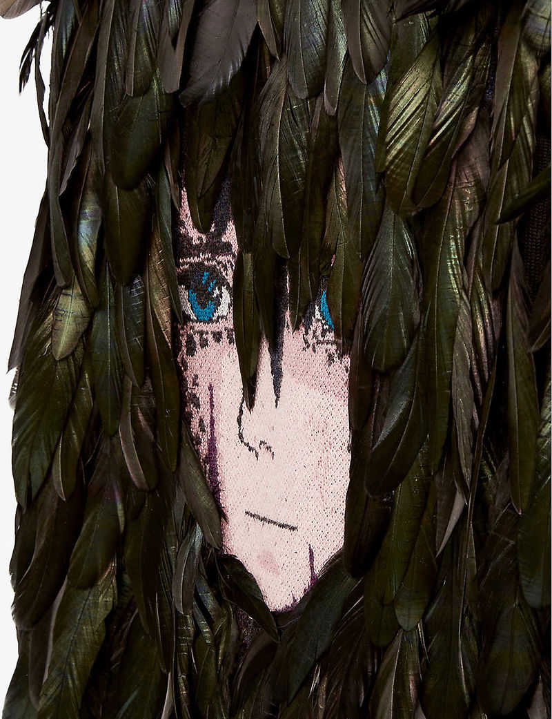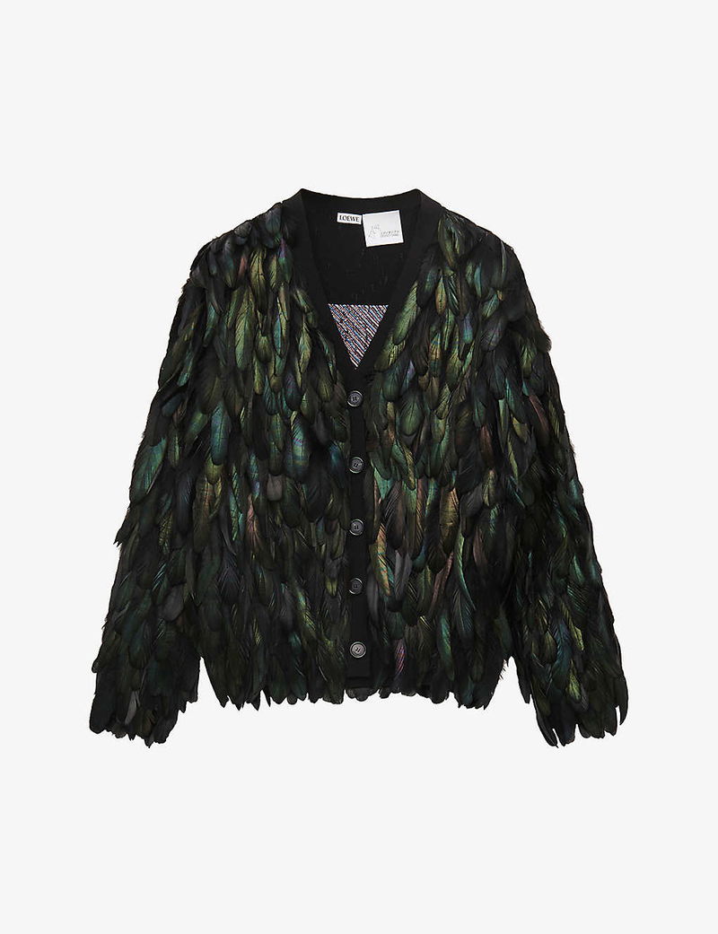 Have you spotted the iridescent feathers of Howl, the magical wizard, scattered across the kingdom of Ingary? Well, follow the trail, and you’ll discover Loewe’s final fantastical collaboration with Studio Ghibli's Howl’s Moving Castle. Hand-sewn from a sumptuous mohair blend, this spellbinding cardigan veils your silhouette in a plume of irised feathers shimmering across its panels like wings. Now, we’ve heard a rumour Howl is waiting for you in The Waste.