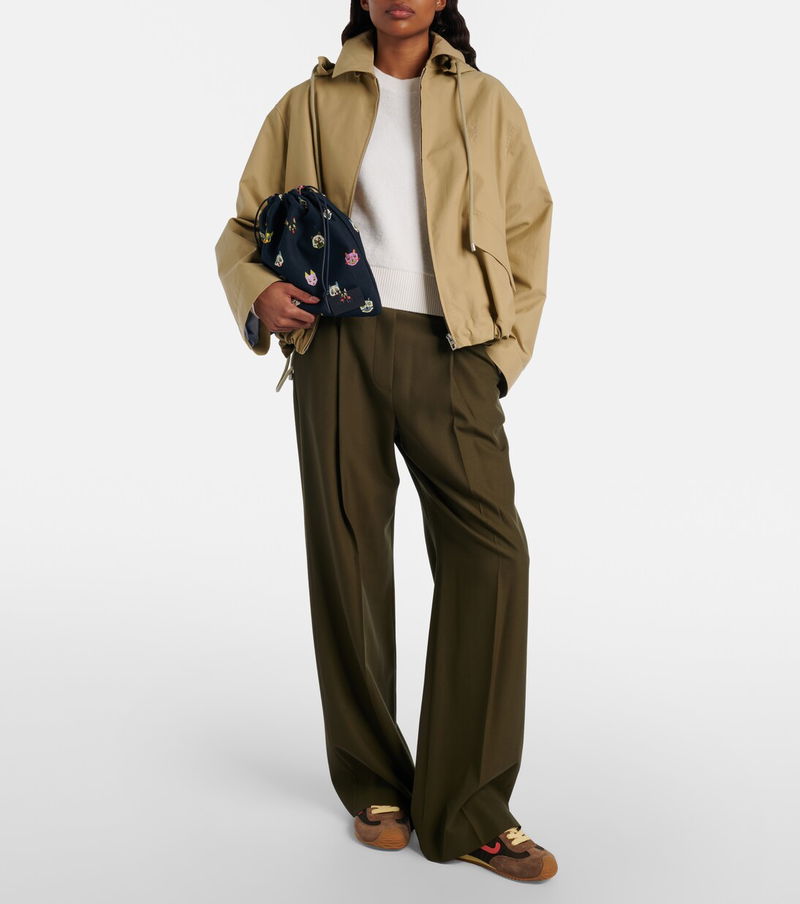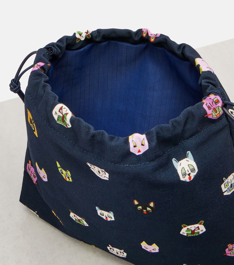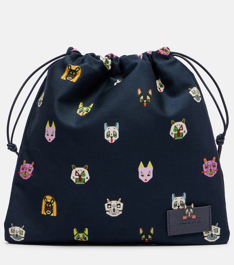 The Cats pouch from Loewe showcases playful motifs inspired by the works of English artist Louis Wain. Crafted from cotton canvas, the style features a drawstring top and leather pulls.