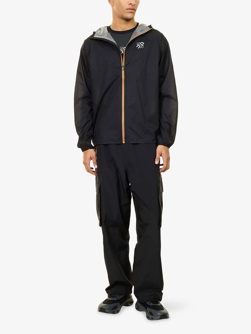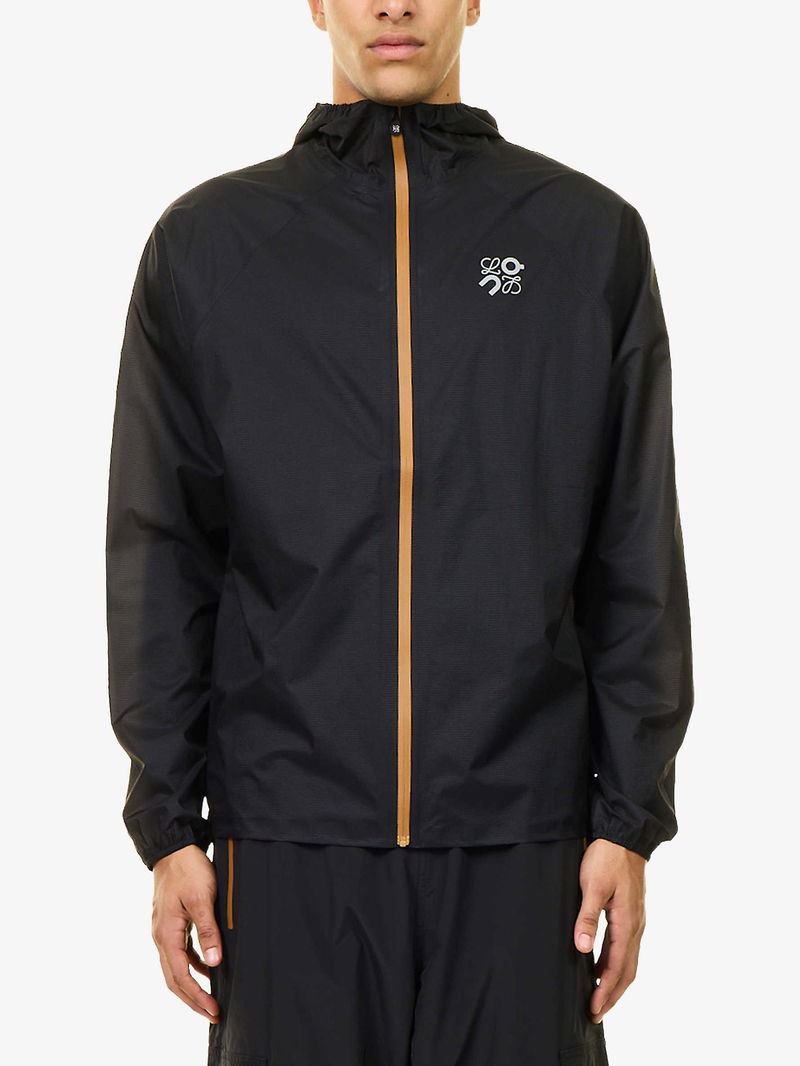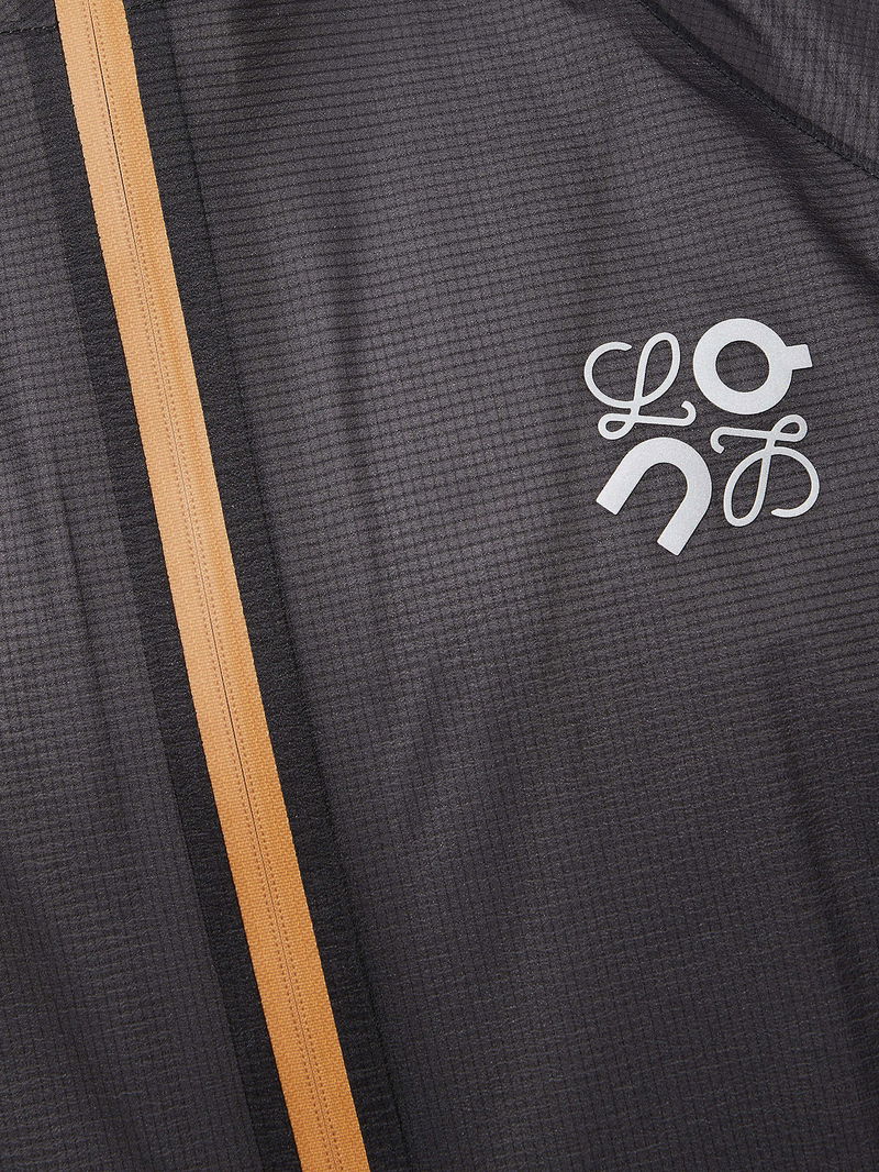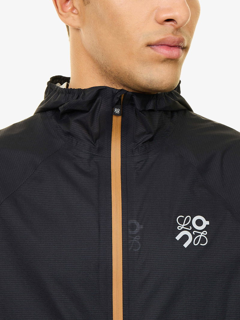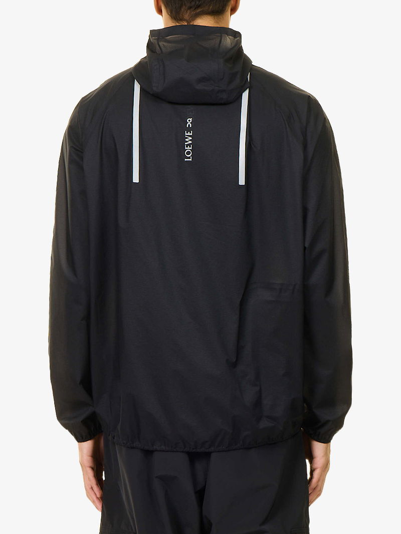 Loewe x ON shell jacket.Elasticated fixed hood, long sleeves, reflective logo print at chest, contrast zip, partially elasticated hem.