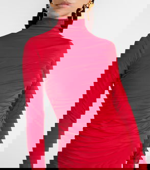 The Lollie maxi dress from Altuzarra features a fitted bodice with a deep V-neckline and a voluminous skirt. This design showcases a ribbed texture on the bodice and ruched details on the skirt.