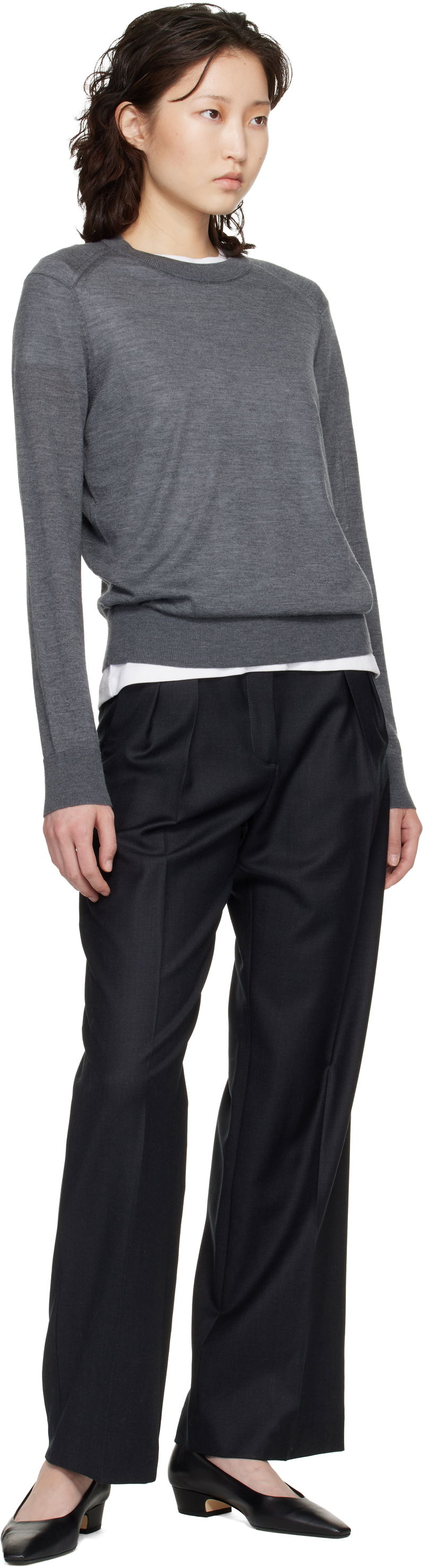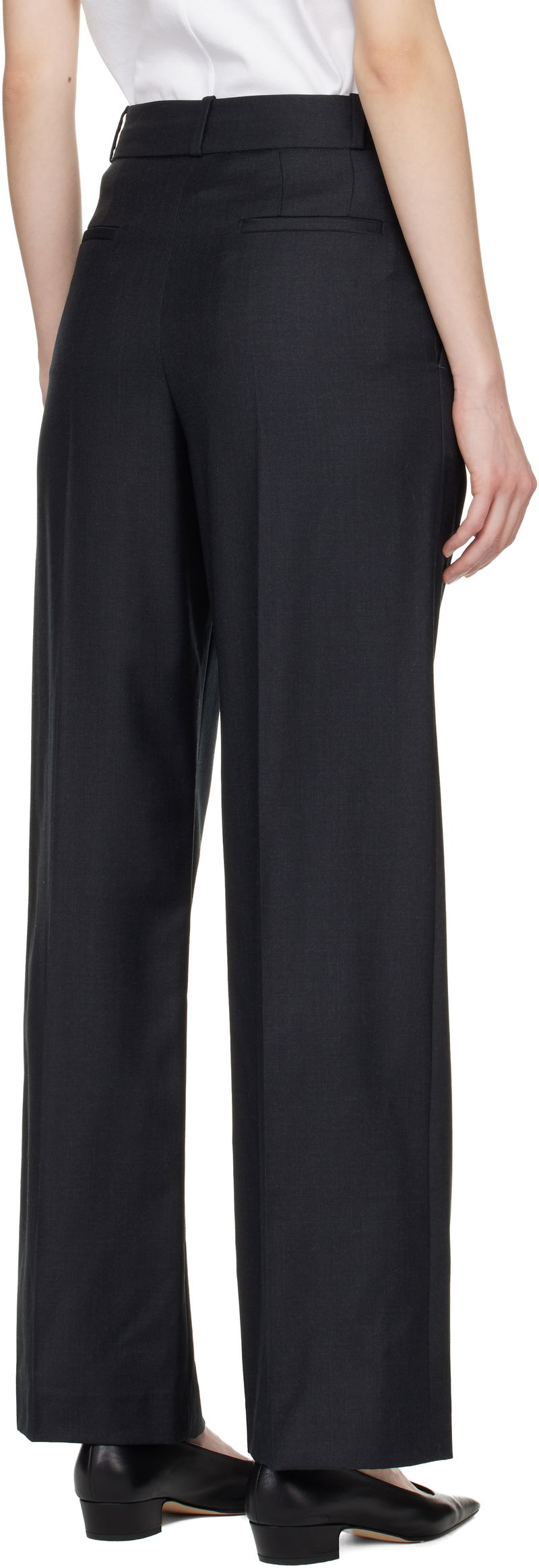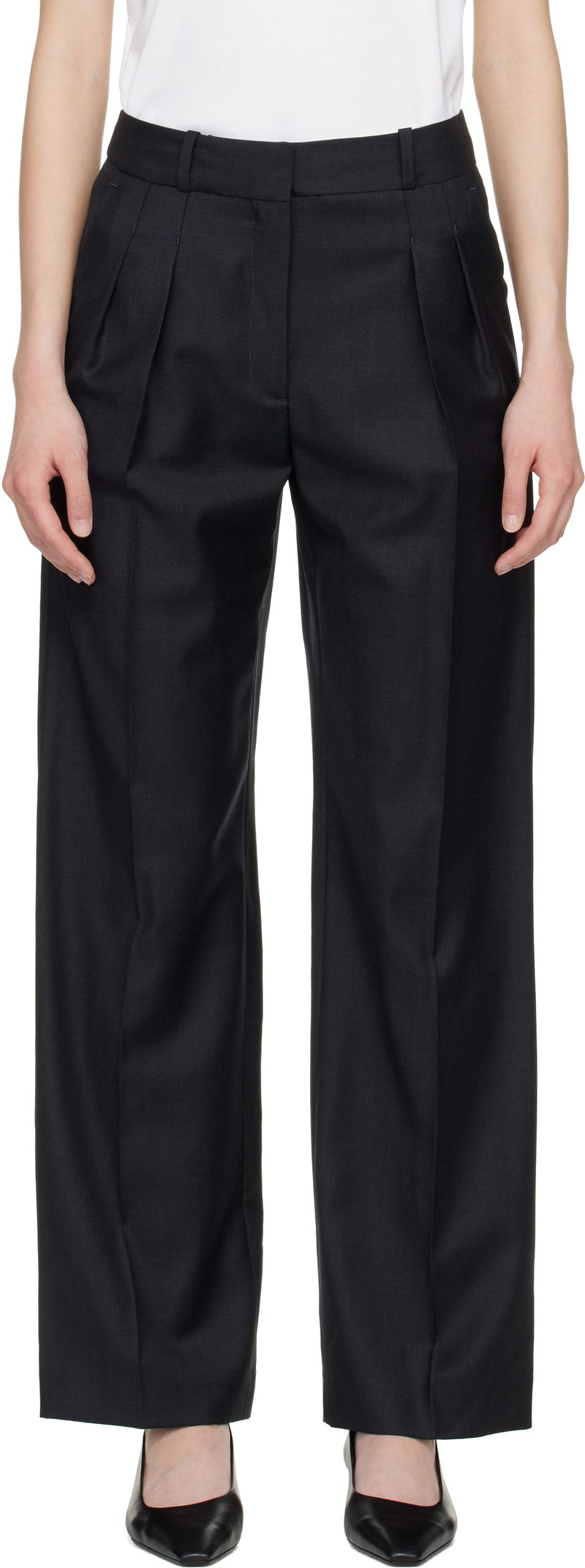Virgin wool twill trousers. Certified OEKO-TEX® Standard 100. Belt loops. Four-pocket styling. Zip fly. Pleats at front. Creased legs.