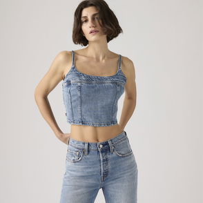 Non-stretch organic cotton denim tank top. Fading throughout.· Paneled construction· Square neck· Cropped hem· Zip closure at side seam· Contrast stitching in yellow.