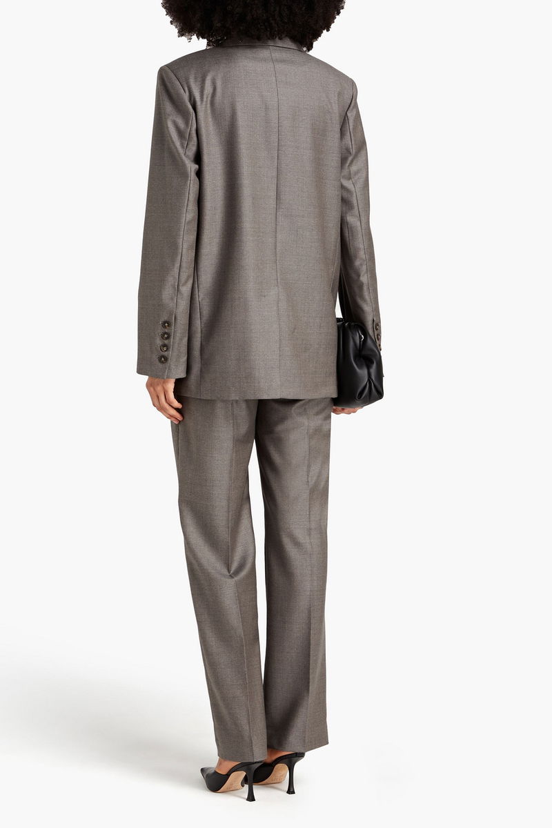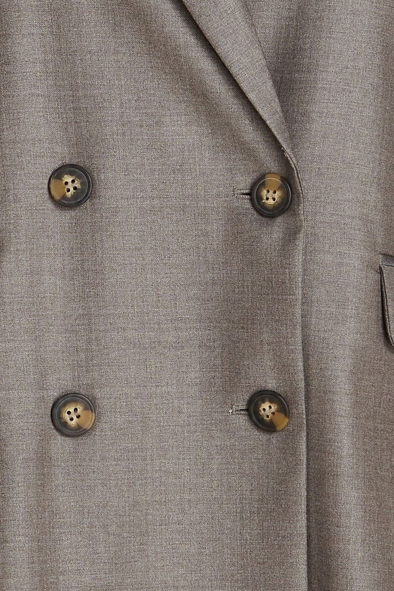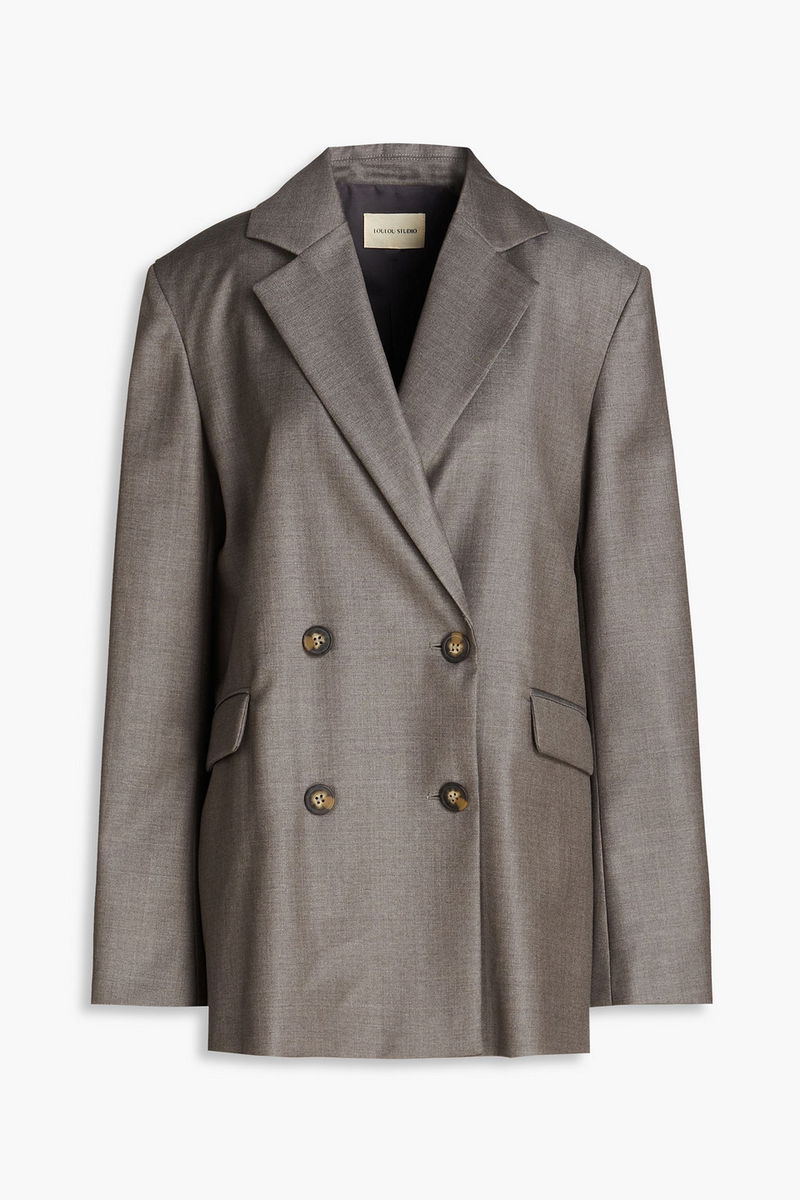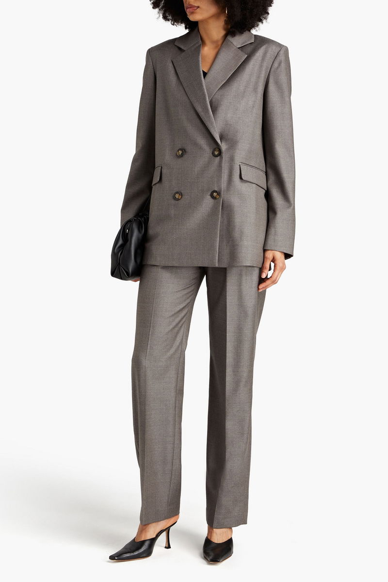 Wool blazer. Featuring shoulder pads, two front flap pockets, button fastenings through double-breasted front and non-stretchy mid-weight fabric. Fully lined.