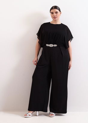 Jumpsuit, Denim, Distressed trims, Belt loops, Buttoned cuffs, Multipockets, Concealed snap and zip fastening at front, Mid-weight, non-stretchy fabric.