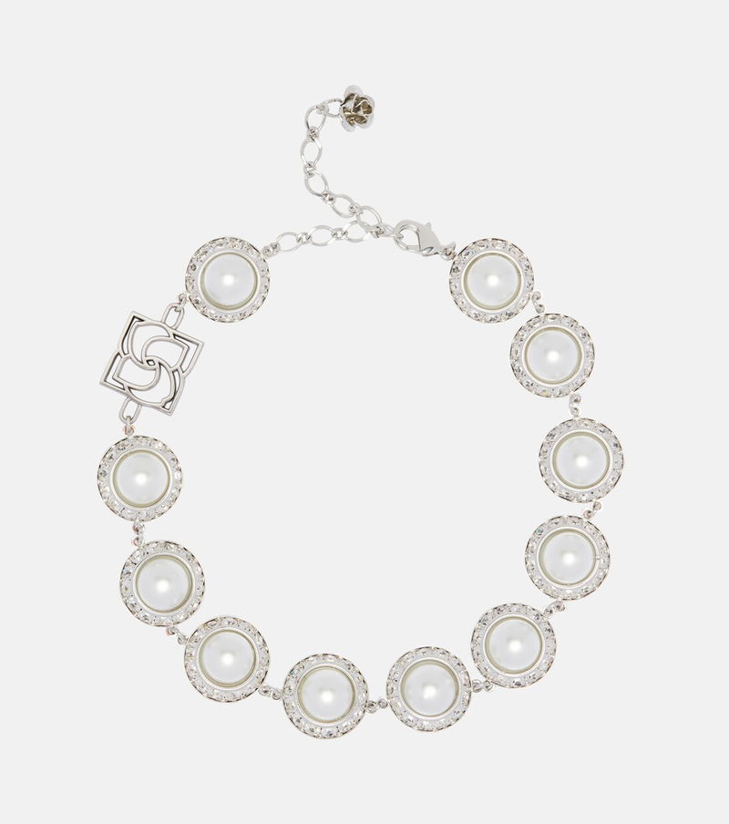Magda Butrym's fantastical vision for contemporary expands to the label's jewelry collection. This necklace wraps around the neck to create a choker effect, appearing with faux pearls, crystal embellishments, and signature floral details.