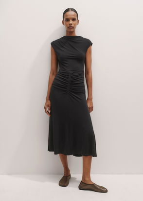 Dress, Crepe, Wool-blend, Satin trims, Cutout, Halterneck, Ruched, Two side slit pockets, Concealed button and zip fastening at back, Button fastening at neck, Partially lined, Slightly stretchy fabric, Mid-weight fabric.