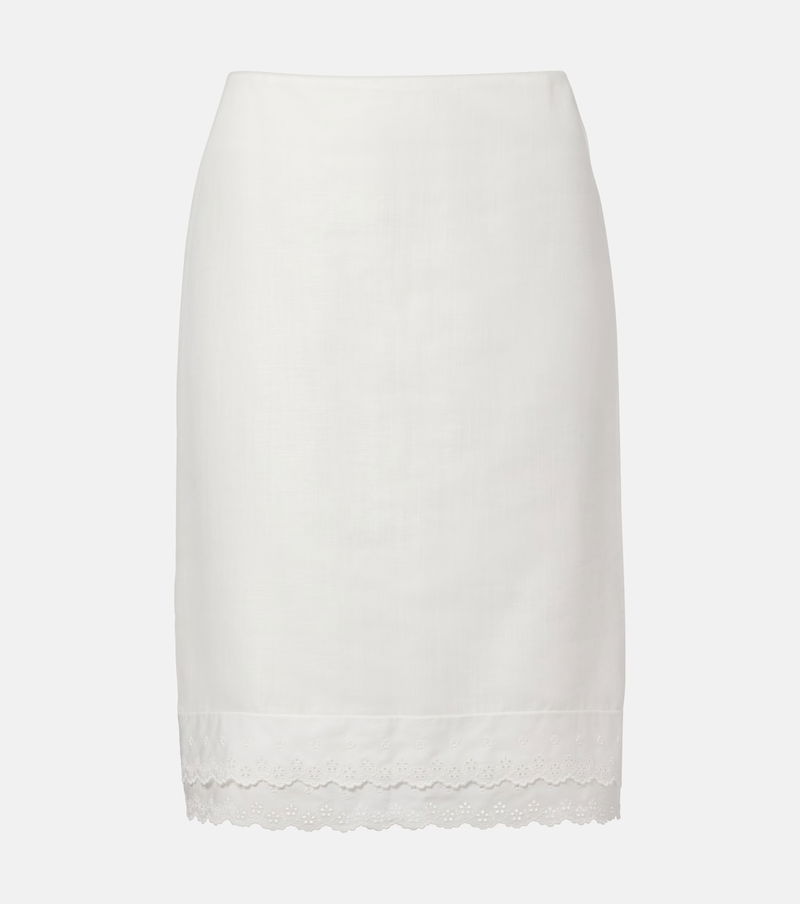 This midi skirt by Magda Butrym is crafted from a white cotton and linen blend. Featuring a layered construction, the design is complete with scalloped lace trims.