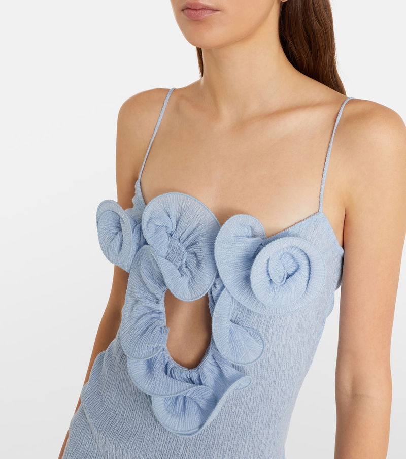 Magda Butrym aims to empower with sharp modern style, expertly delivered through artisanal excellence. Crafted from textured crêpe, this minidress is designed with slender spaghetti straps and a deep neckline adorned with gathered ruffles twisted into floral shapes.