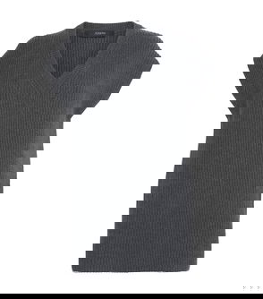 Maison Margiela knits this grey sweater vest from wool with a V-neck, then accents with a Four Stitches logo at the nape and distressed effects.