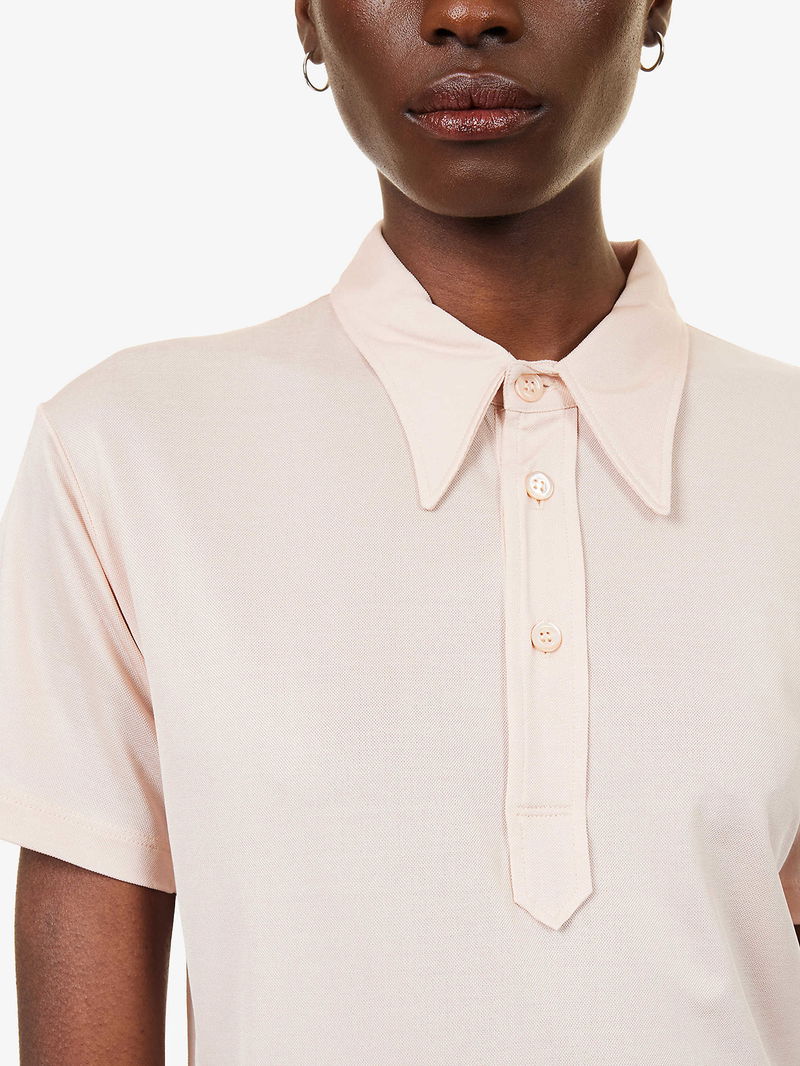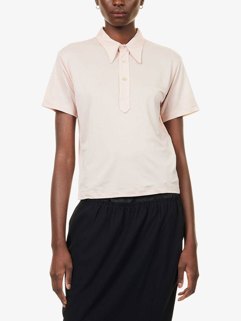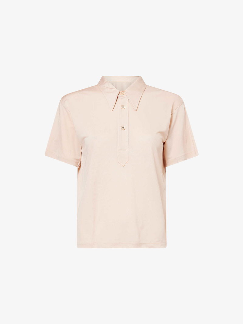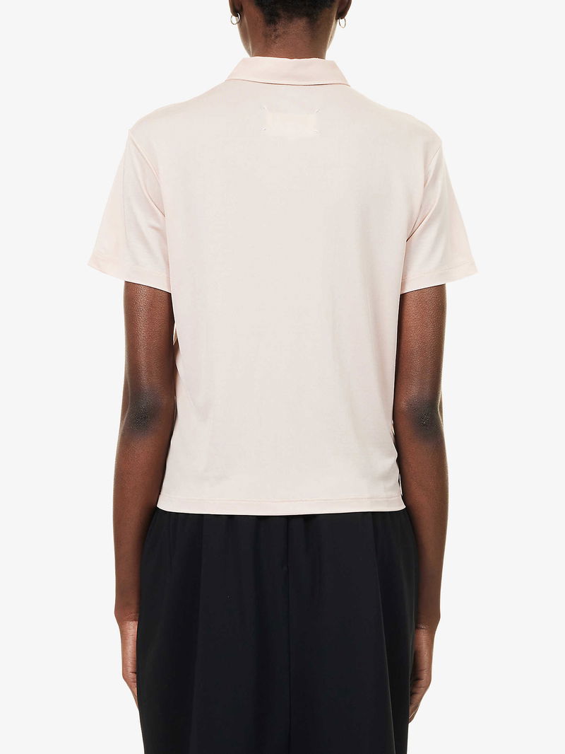 Maison Margiela stretch-woven polo shirt. Regular fit, straight-point collar, dropped shoulders, short sleeves, three-button placket, branded pearlescent buttons, four-stitch logo at back, slightly sheer finish.