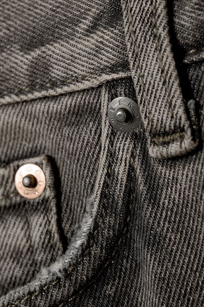 Maison Margiela denim jeans. Exposed button and zip-fly fastening. Relaxed fit, mid rise, wide leg, belt loops, classic five pockets, faded wash, splits at sides, signature brand four-stitch at back yoke.