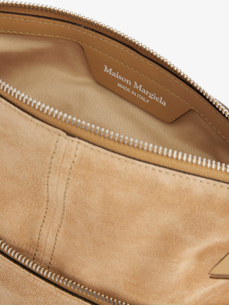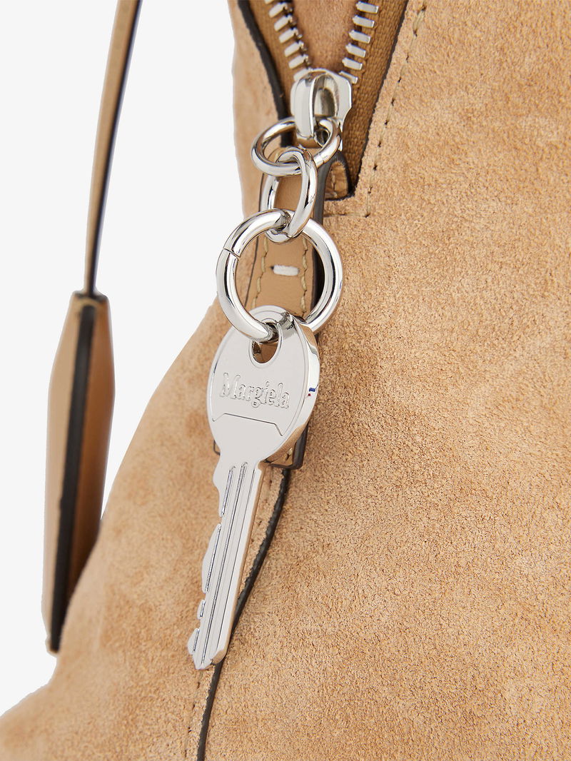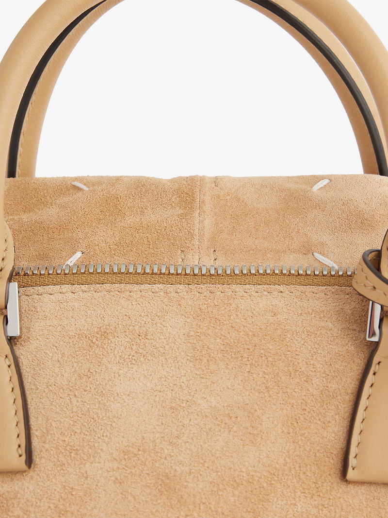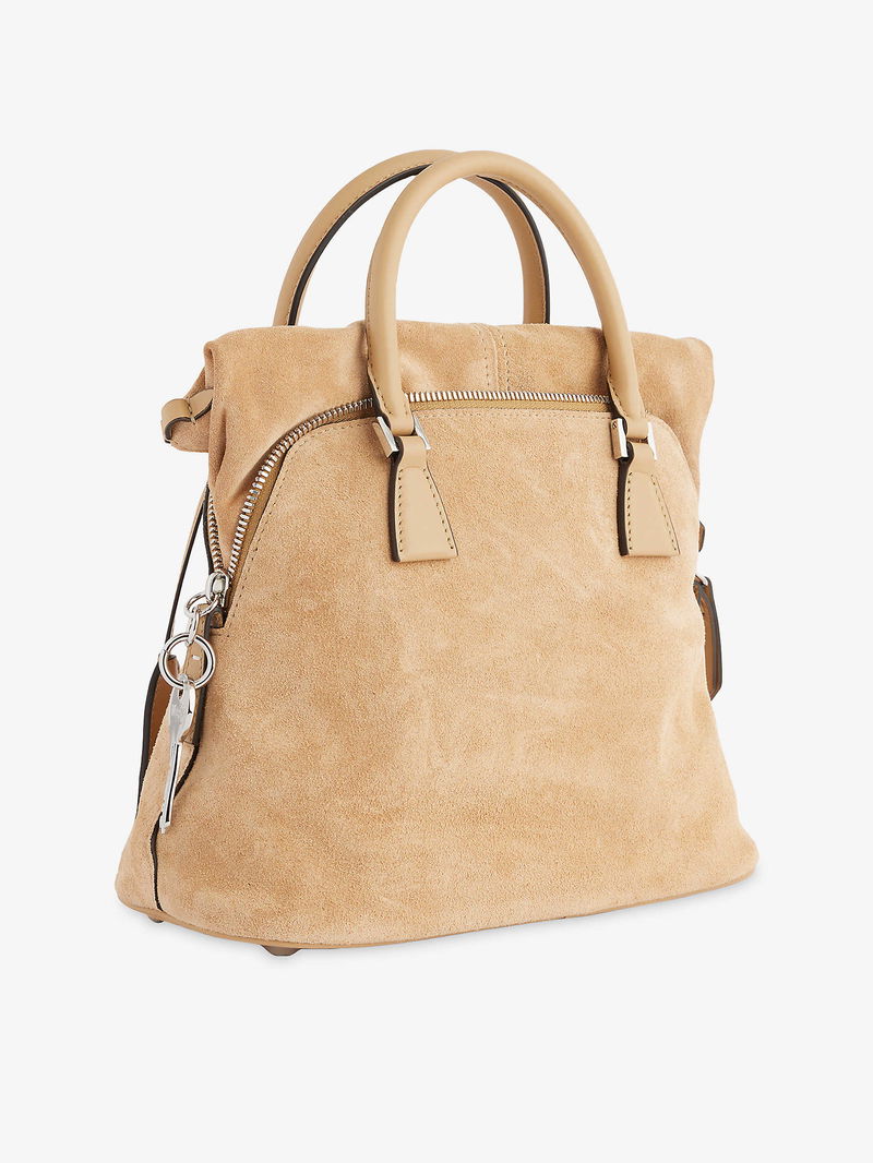 Maison Margiela suede top handle bag. Double top handles, detachable adjustable strap, foldable panel at top, four stitch signature at front, detachable keyring and tag, key at side, five protective feet at base, all-over suede leather, smooth leather trims, silver-toned hardware, one main compartment, internal zip and slip pockets, fully lined