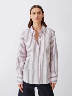 Maison Margiela's shirt is both classic and directional. Made from crisp, striped cotton-poplin, it's tailored with extended cuffs and an exaggerated curved hem. The signature four stitches detail the back.