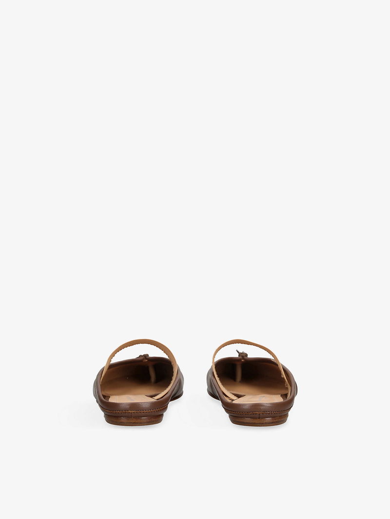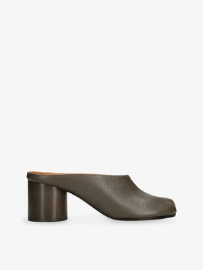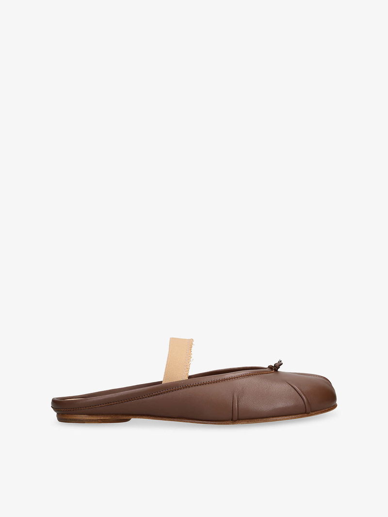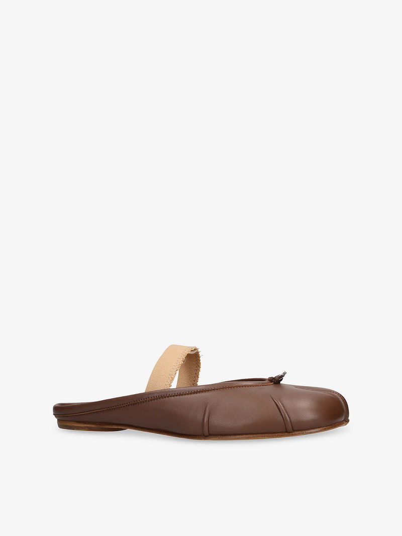 Maison Margiela leather mules. Closed sculpted toe, split-toe front, knotted detail at front, elasticated strap at top, backless, flat sole.