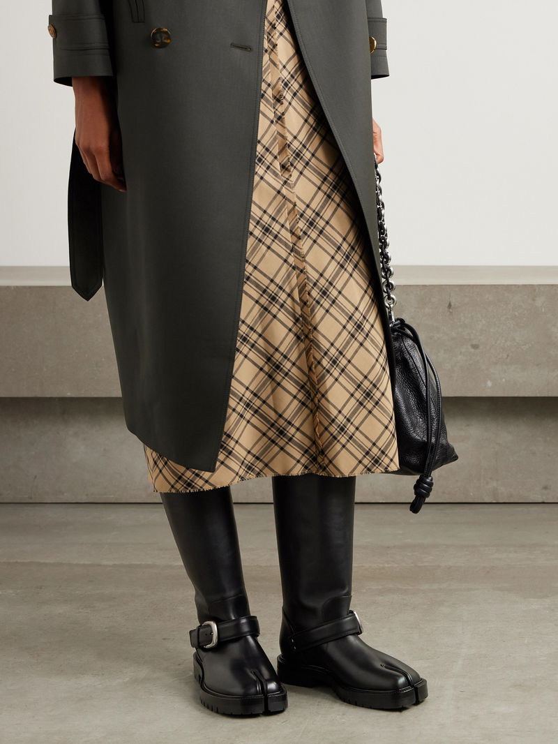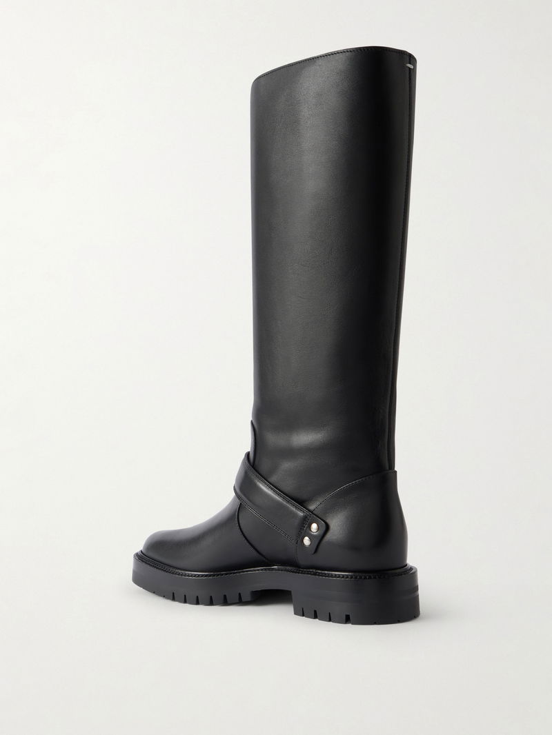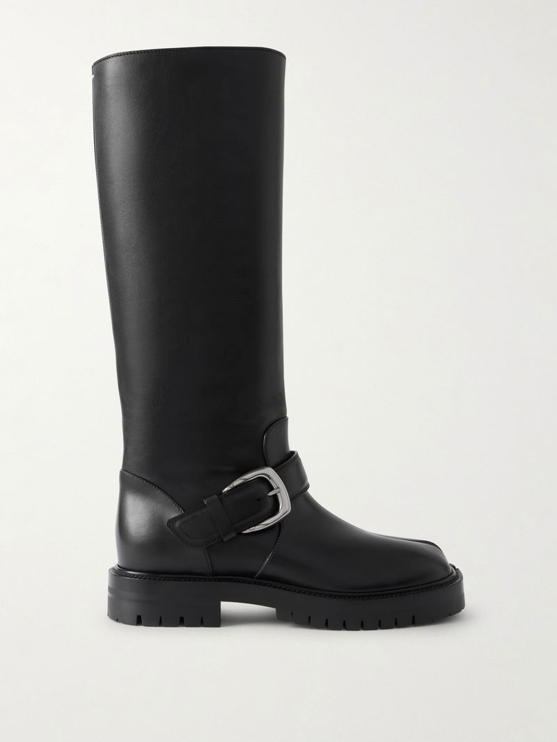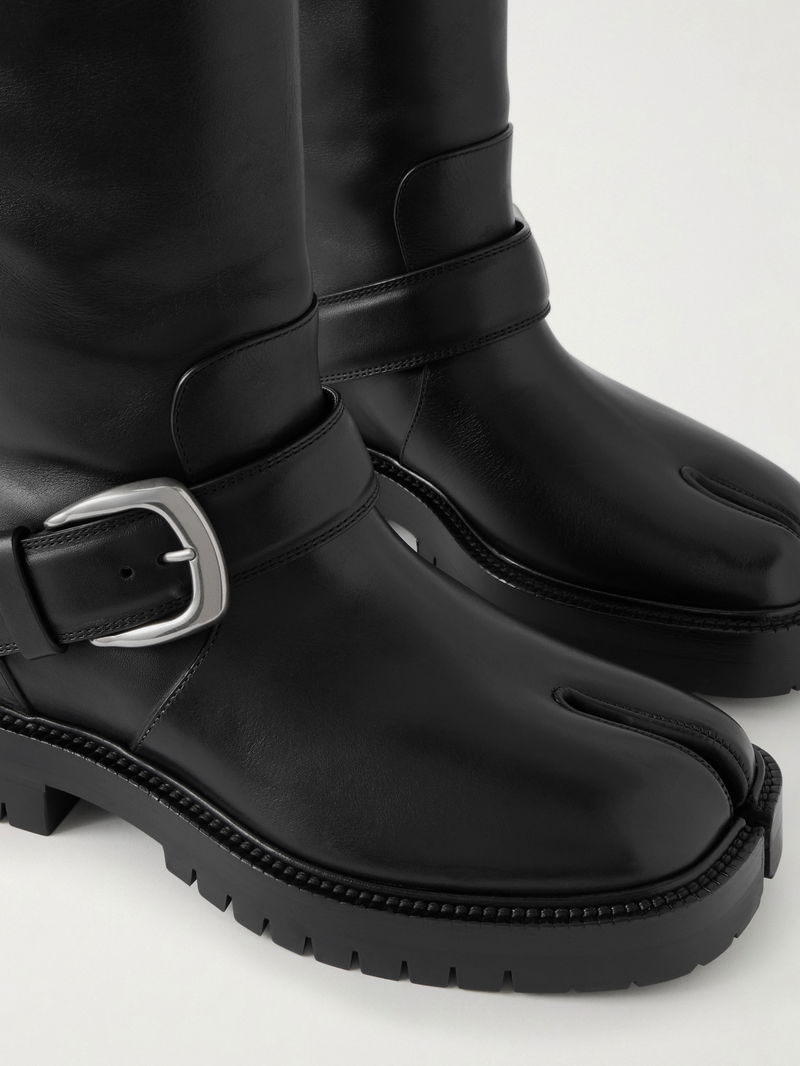Maison Margiela’s iconic ‘Tabi’ boots feature the signature split toe, inspired by 15th-century Japanese footwear. Made from supple leather, they have silver-tone buckled straps and rest on durable rubber lugged soles for grip.