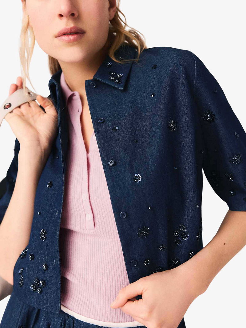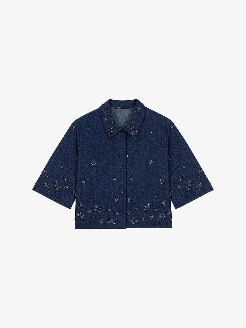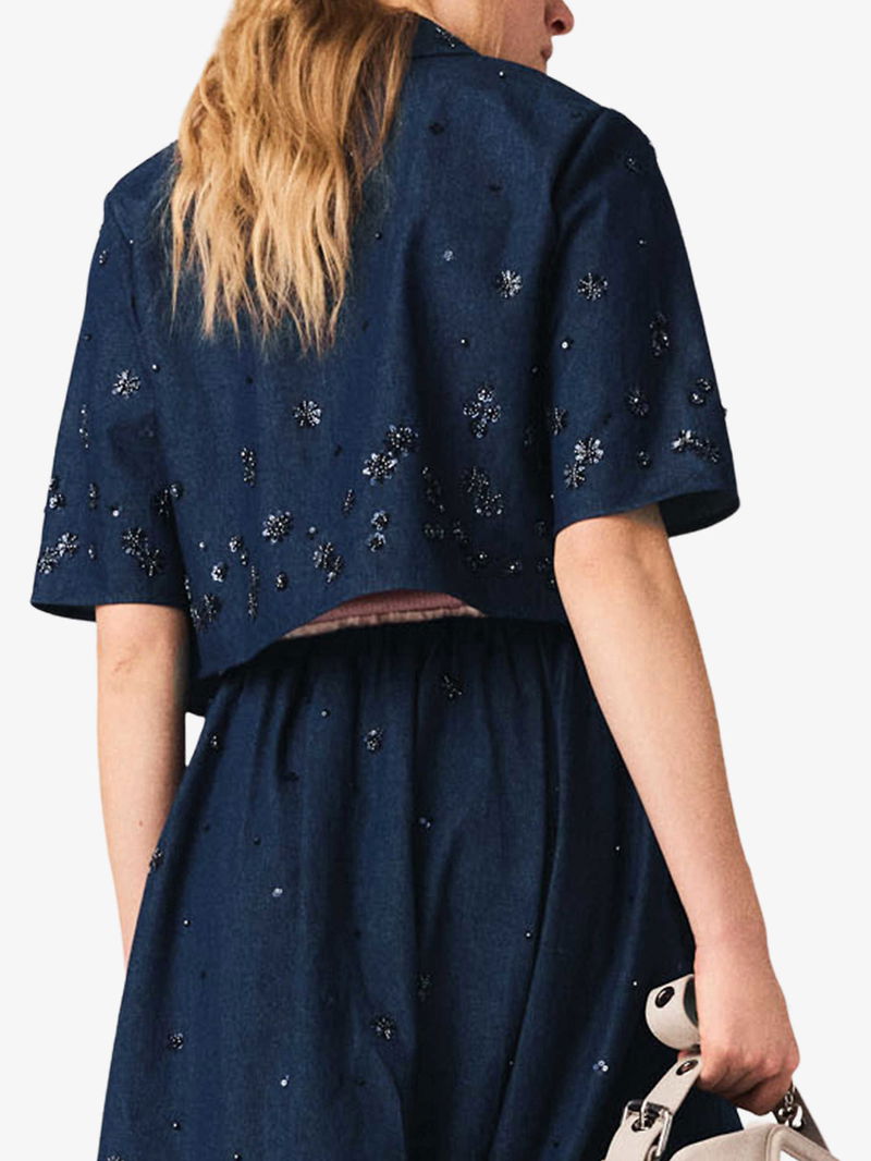 Bead-Embellished Cropped Denim Shirt