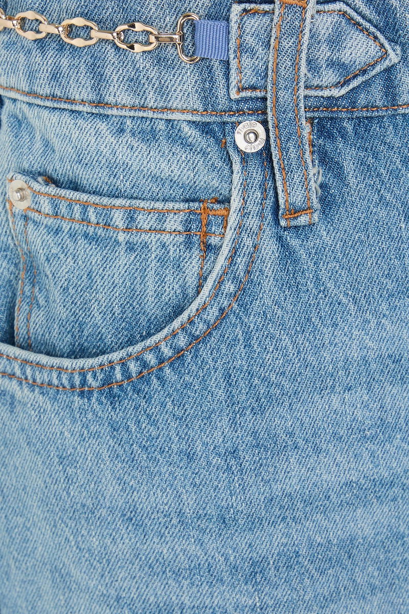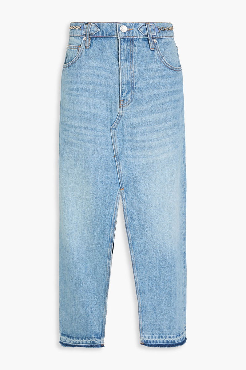 Skirt, Faded, Denim, Chain-embellished, Five pockets, Front and back splits, Button and concealed zip fastening at front.