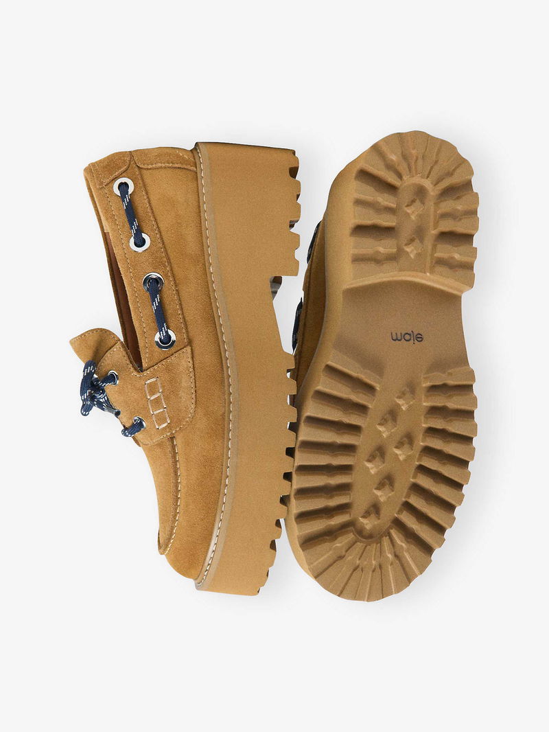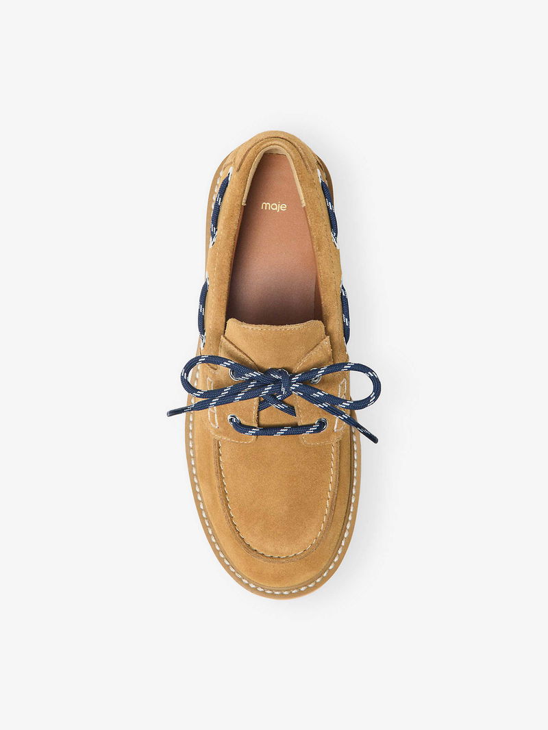 Maje suede boat shoes. Round closed toe, contrast laces, contrast stitching, platform sole.