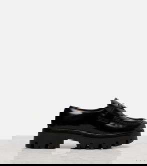Loafers, Leather, Embellished, Platform, Round toe, Slip on, Rubber lug sole.