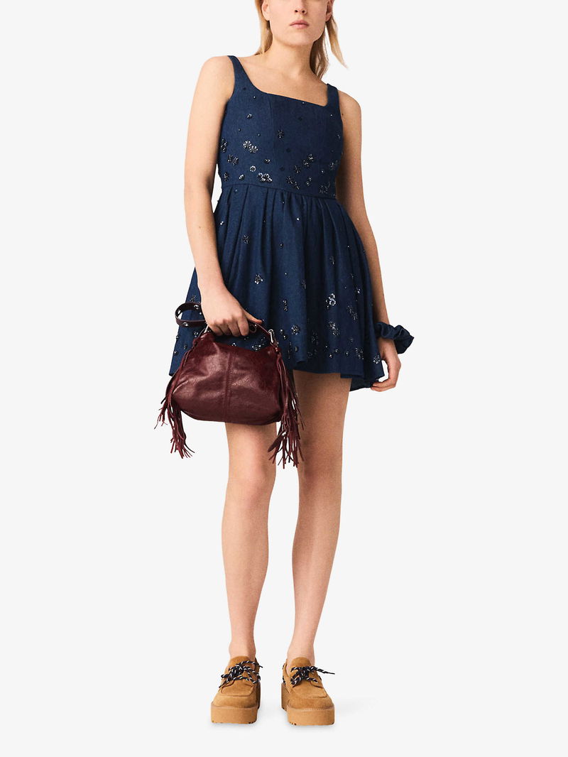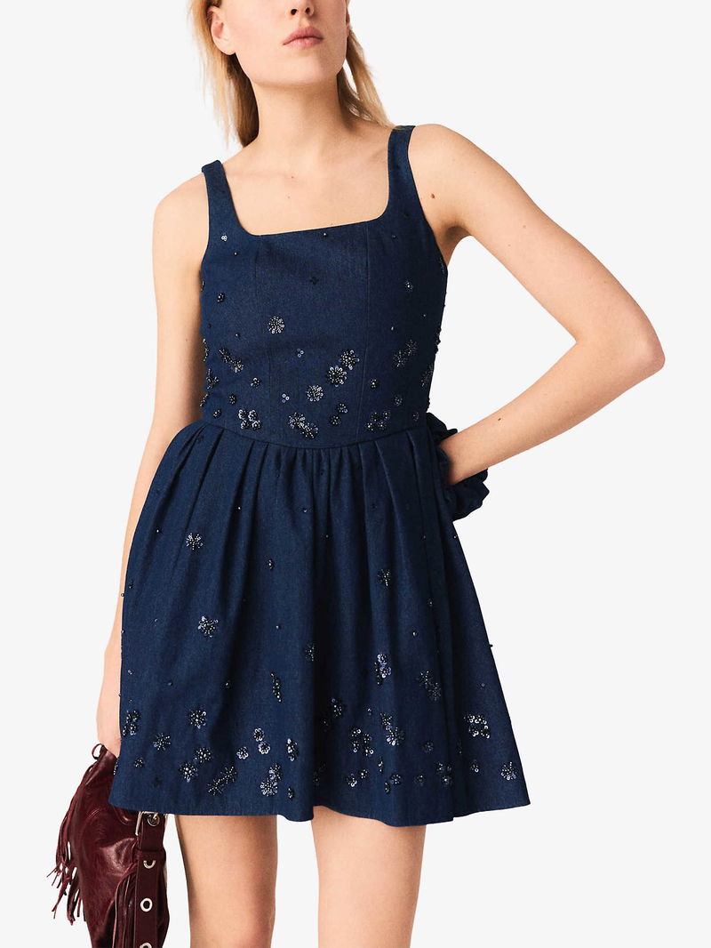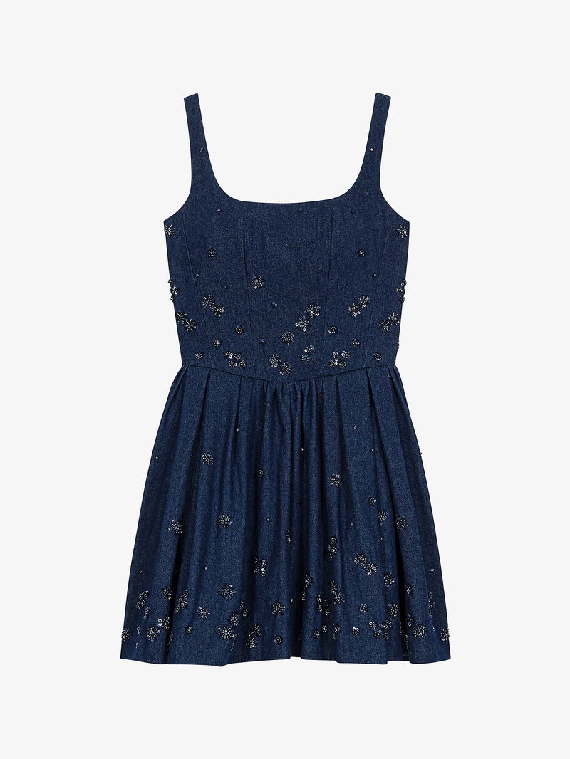 Flared Sequin-Embroidered Denim Dress