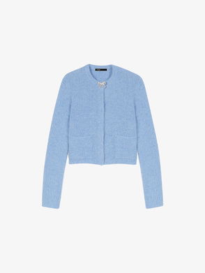 Cardigan, Metallic, Knitted, Ribbed trims, Front patch pockets, Hook fastenings through front, Mid-weight knit.