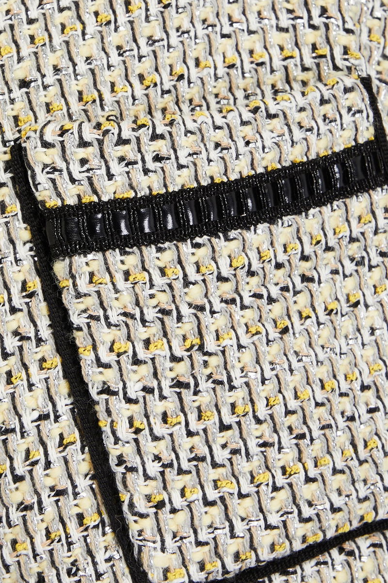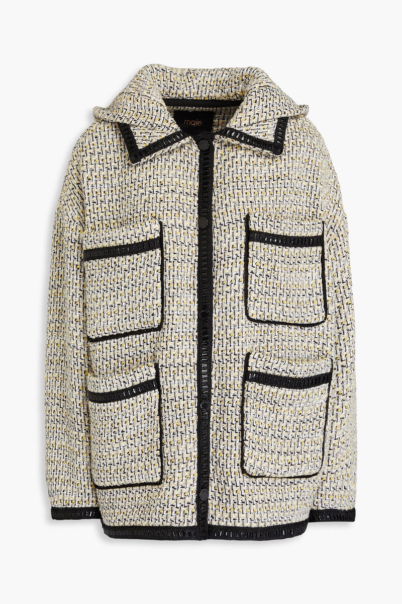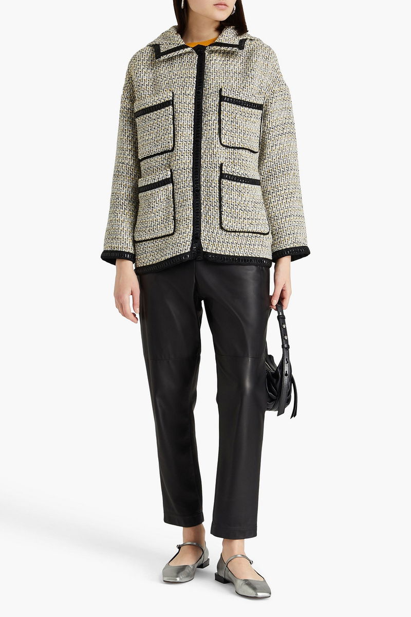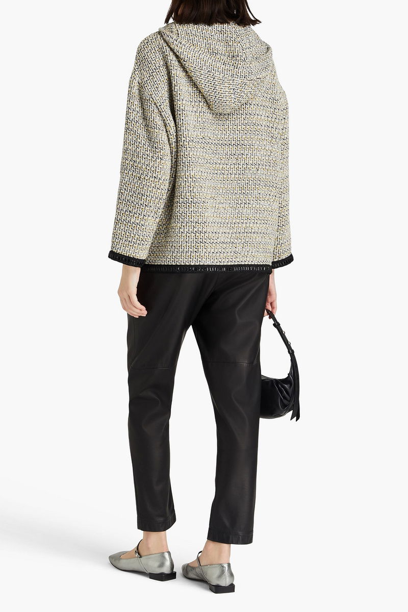 Jacket, Metallic, Tweed, Hooded, Grosgrain trims, Front patch pockets, Snap fastenings through front, Non-stretchy fabric, Mid-weight fabric.