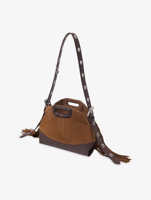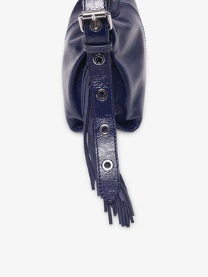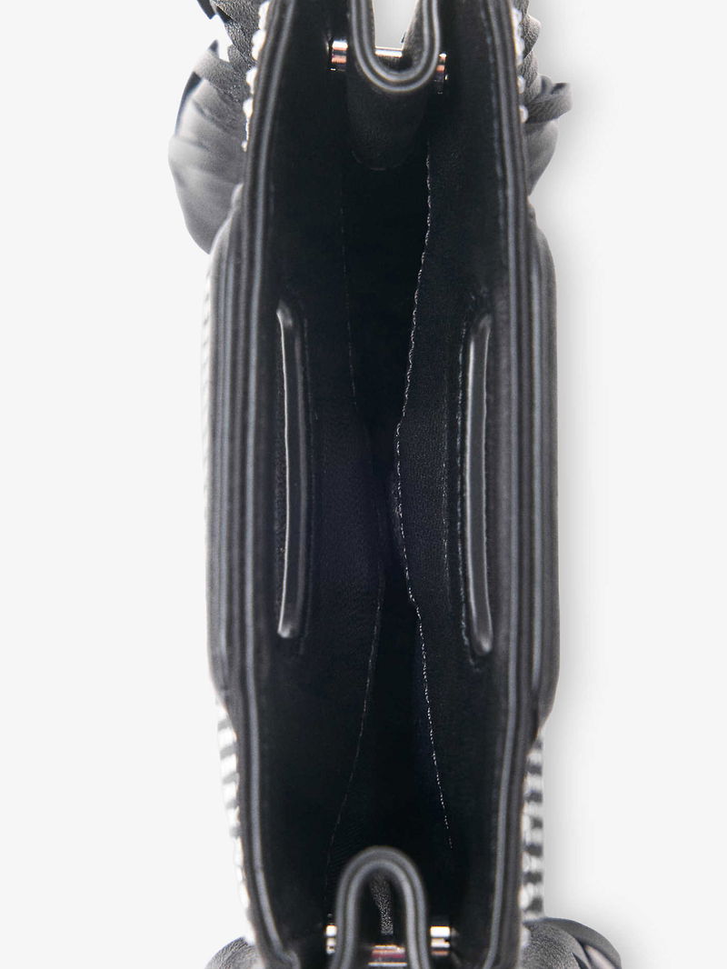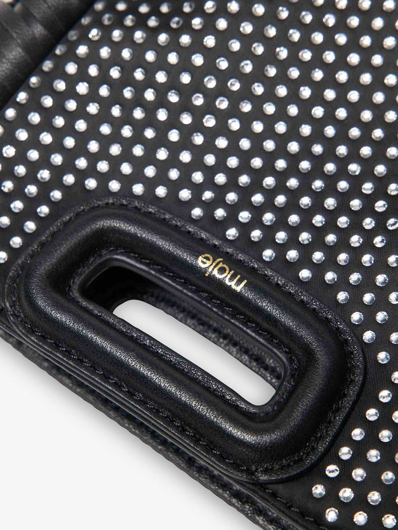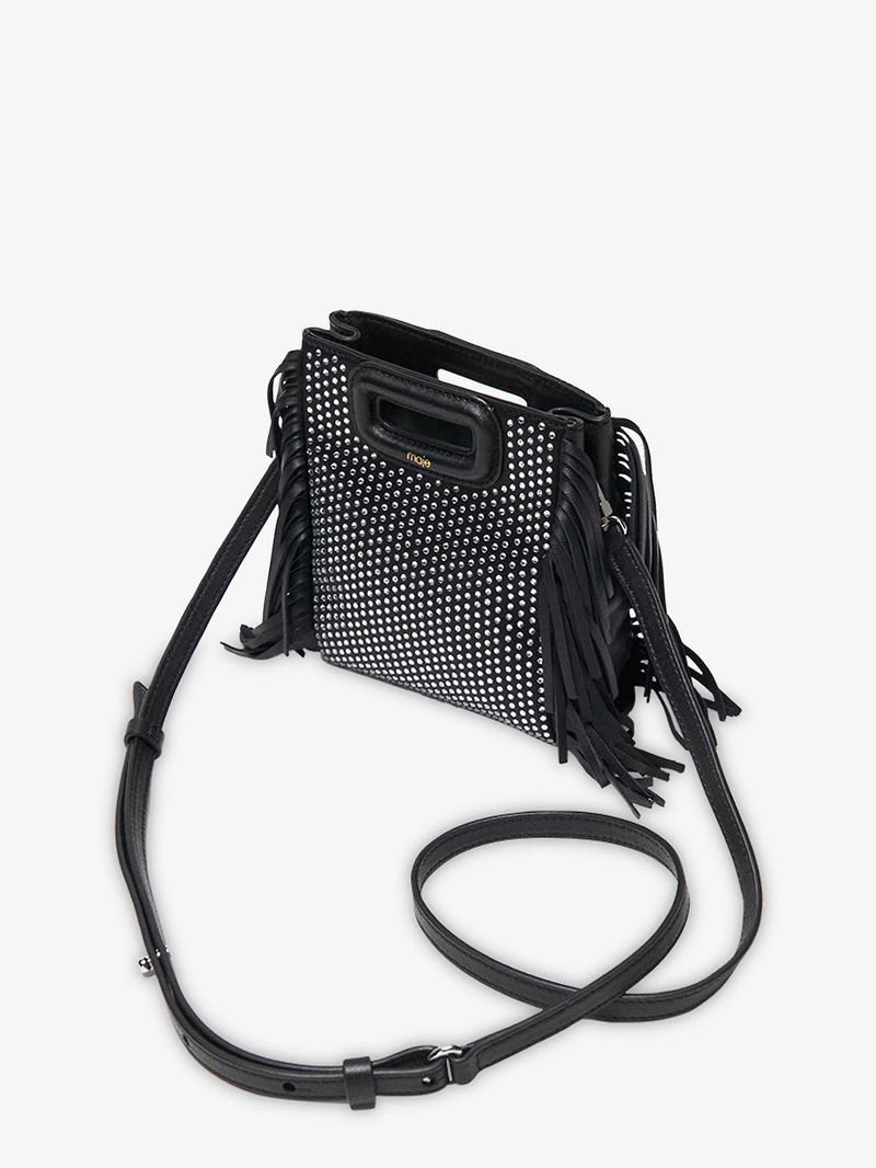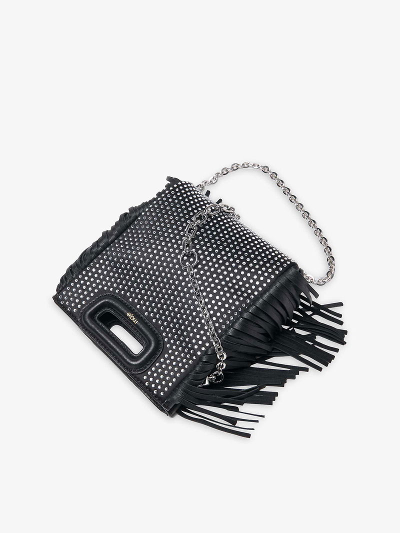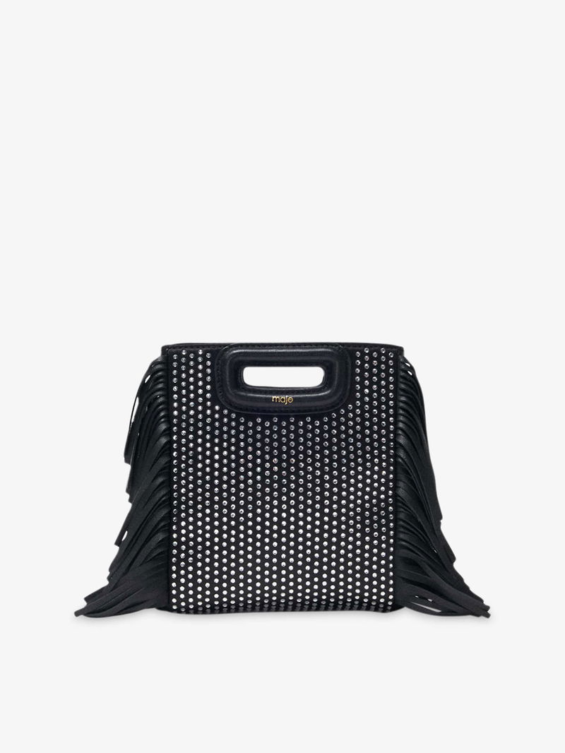 Structured silhouette, detachable leather strap, top handles, one main compartment, all-over rhinestone embellishment, fringed trim.