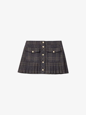 Wrap skirt, Checked, Twill, Pleated, Frayed trims, Belt loops, Two side slit pockets, Button fastenings along front, Mid-weight, non-stretchy fabric.