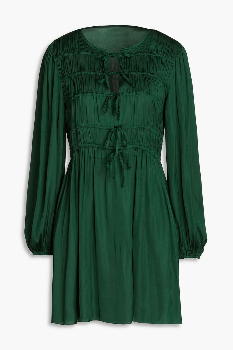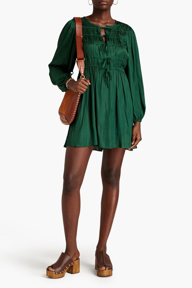 Dress, Satin, Shirred, Lace-up front, Elasticated cuffs, Slips on, Fluid fabric, Mid-weight fabric.