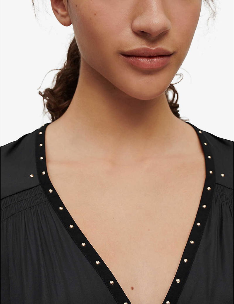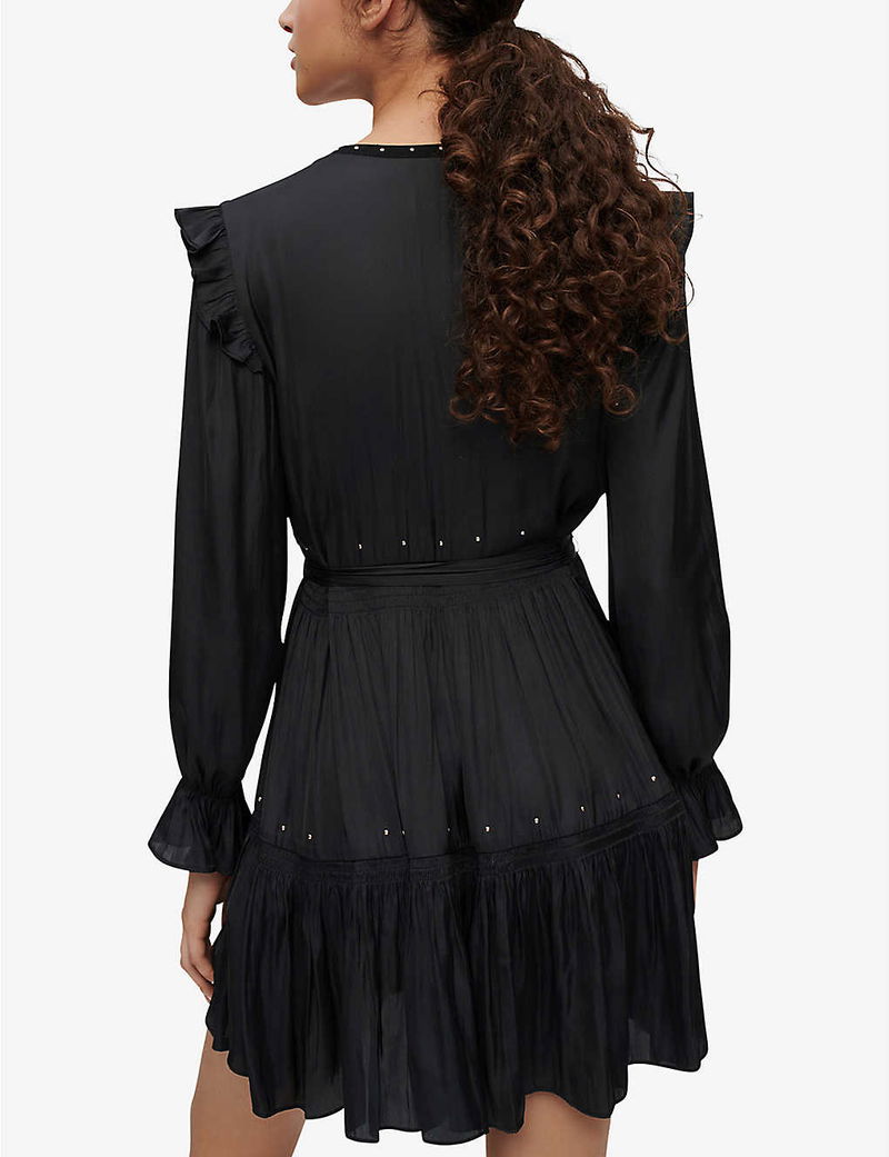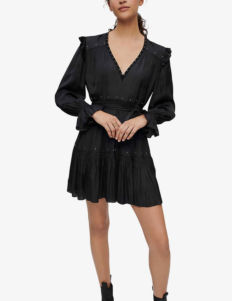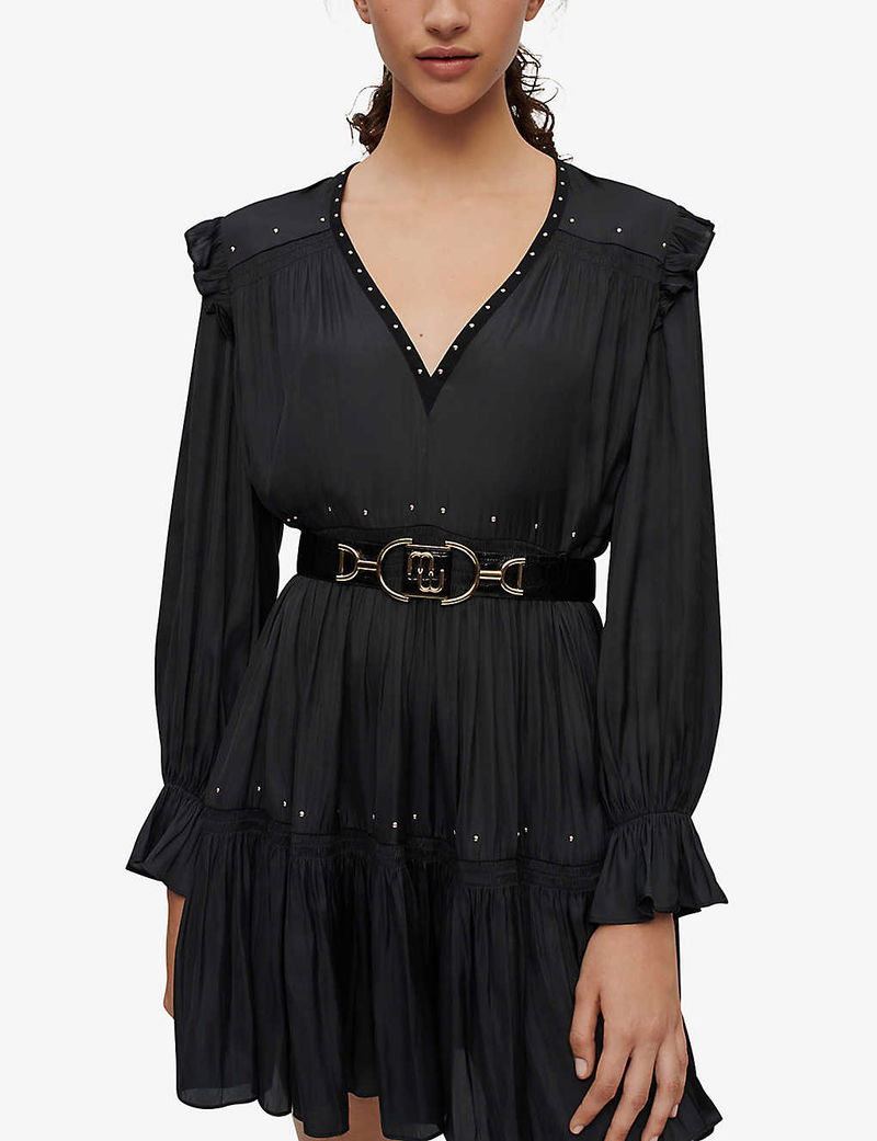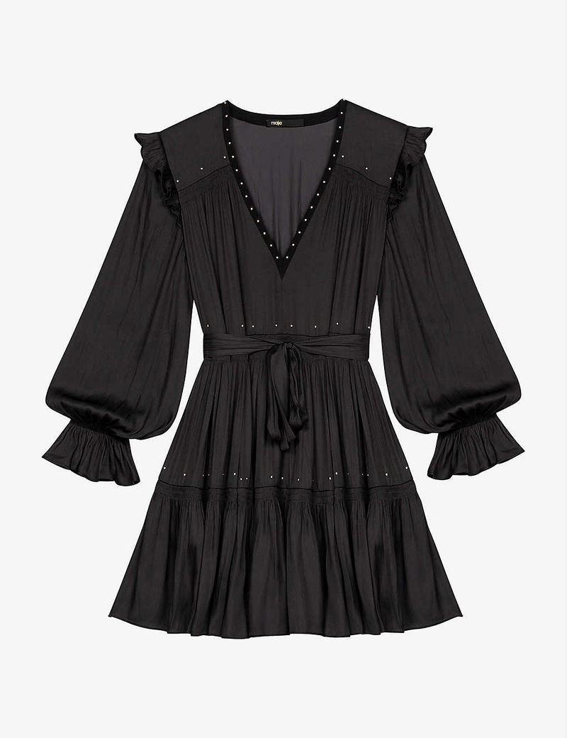 Maje woven mini dress. Self-tie fastening. Mini length, long balloon sleeves, V neck, all-over pleating, mini stud embellishments, frilled shoulders and cuffs, tied waist belt, tiered skirt.
