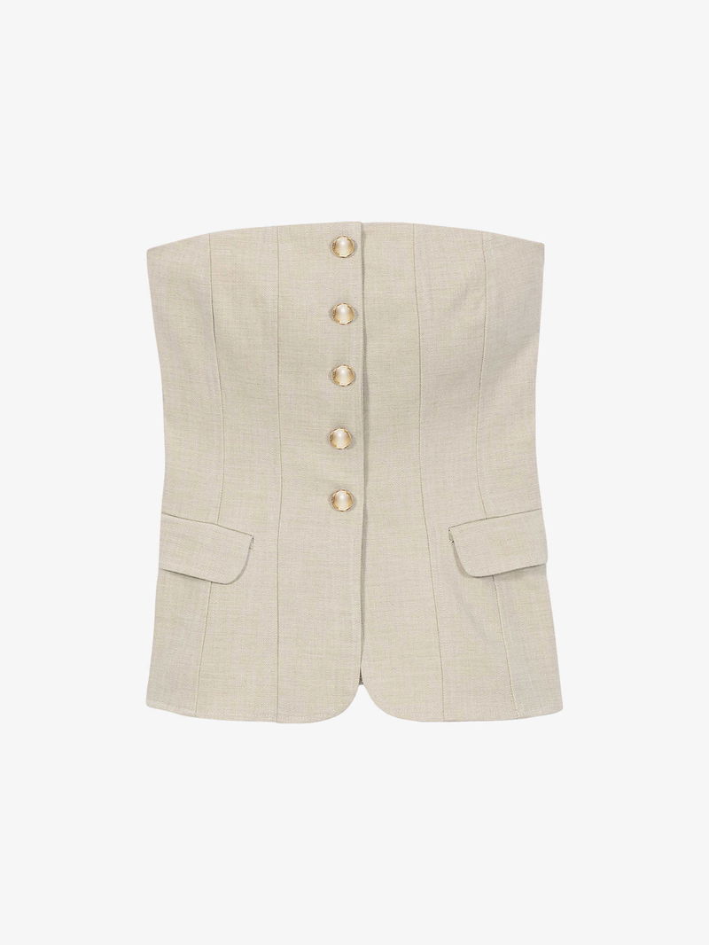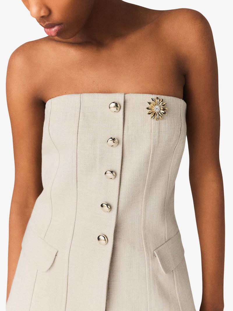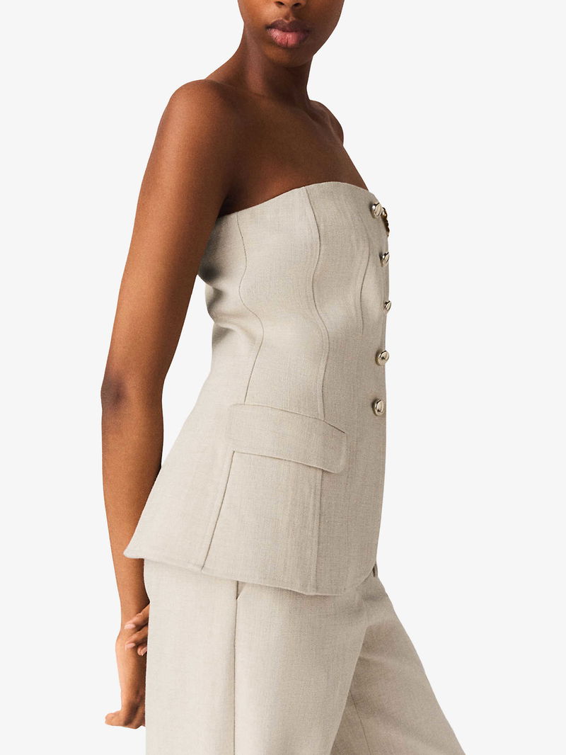 Maje stretch-woven bustier top. Exposed zip fastening at back. Slim fit, straight-across neckline, strapless, gold-toned domed buttons, two mock flap pockets at front, pointed hem.