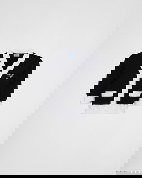 Cardigan, Striped, Knitted, Braided trims, Front patch pockets, Snap fastenings through front, Mid-weight knit.