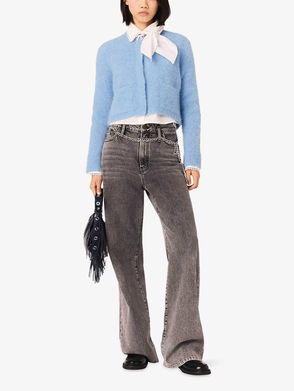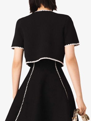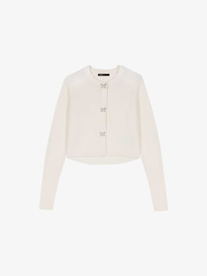 Maje knitted cardigan. Open front. Regular fit, round neck, short sleeves, striped trim. Midweight, slight stretch.