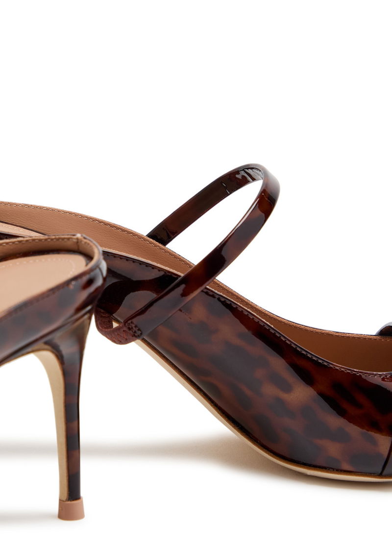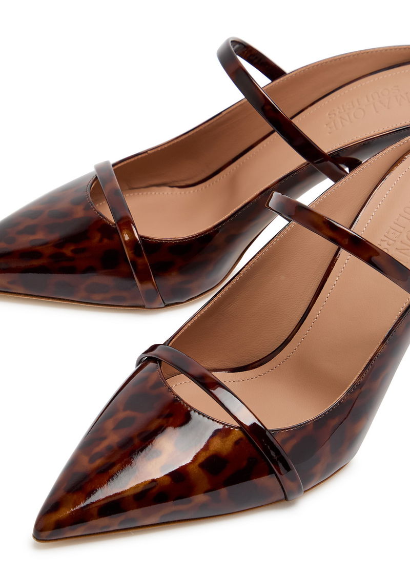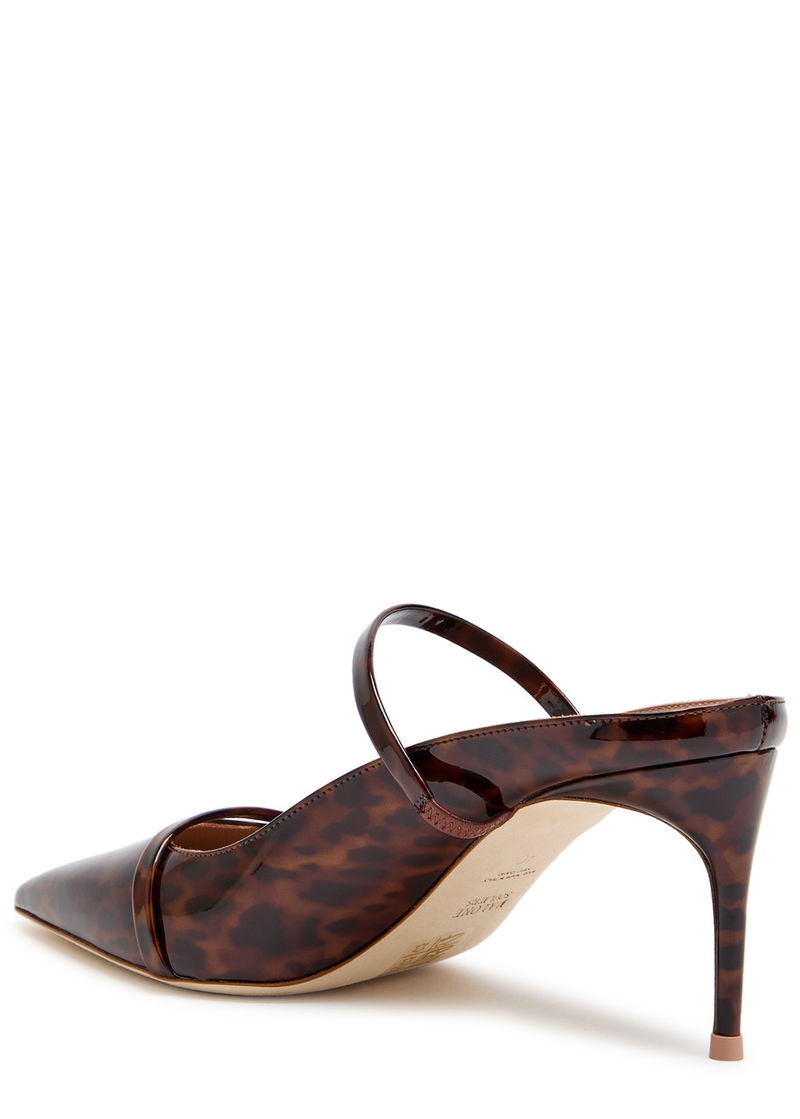 Handmade Malone Souliers patent leather mules. Leopard print, strap details, pointed toe.