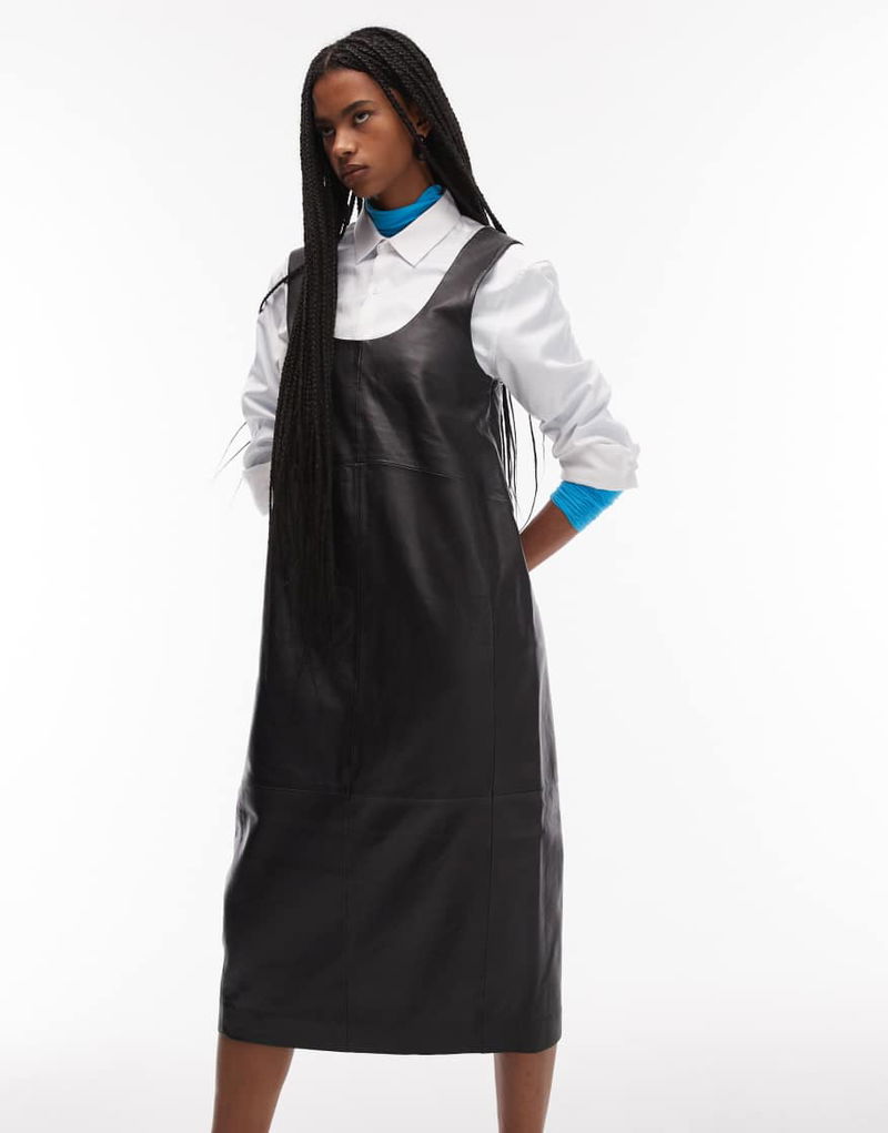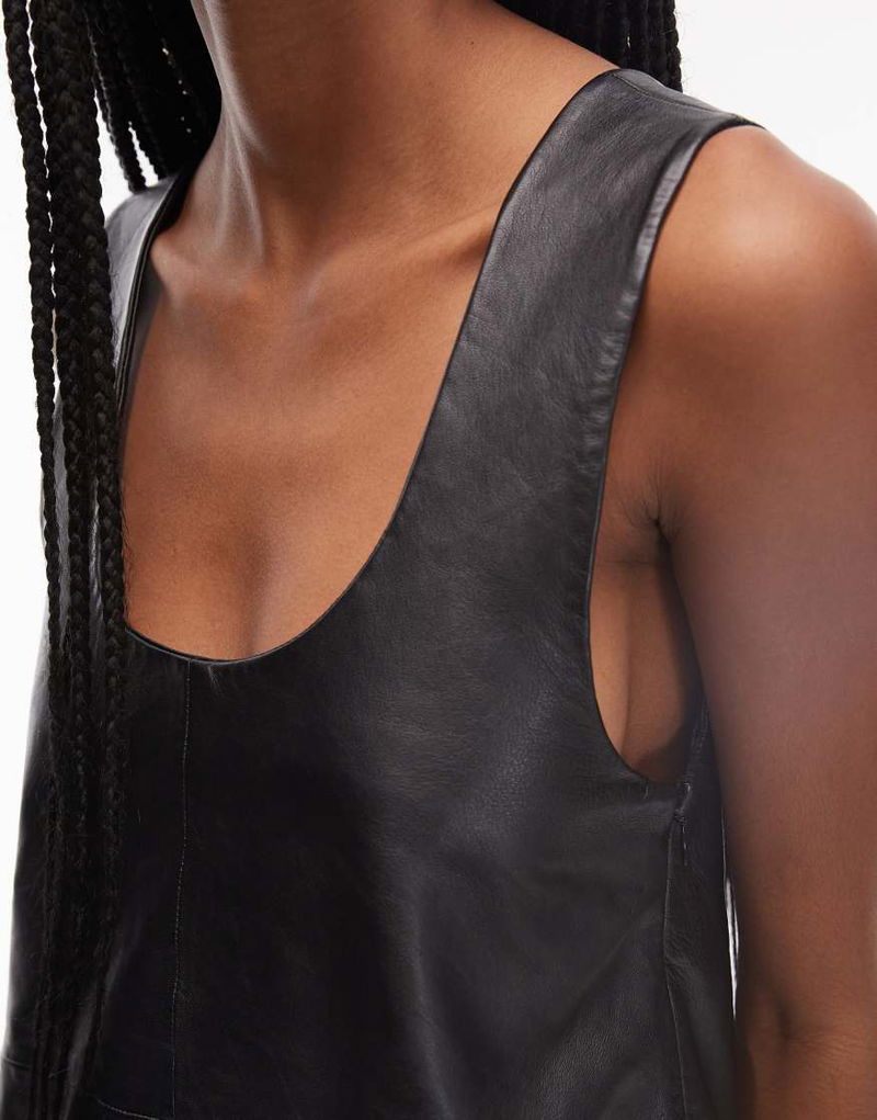 100% Leather Square Neck Sleeveless Midi Dress In Black
