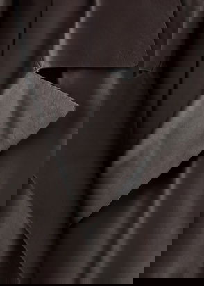 Straight design, Crossover design, Medium design, Lapel-collar, Long sleeve, Buttoned cuffs, Two side pockets, Button fastening on the front section, Adjustable belt, Back-slit hem, Tortoiseshell effect buttons.