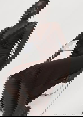 Stretch fabric. Midi design. A-line design. Asymmetrical neckline. Long sleeves. No fastening.